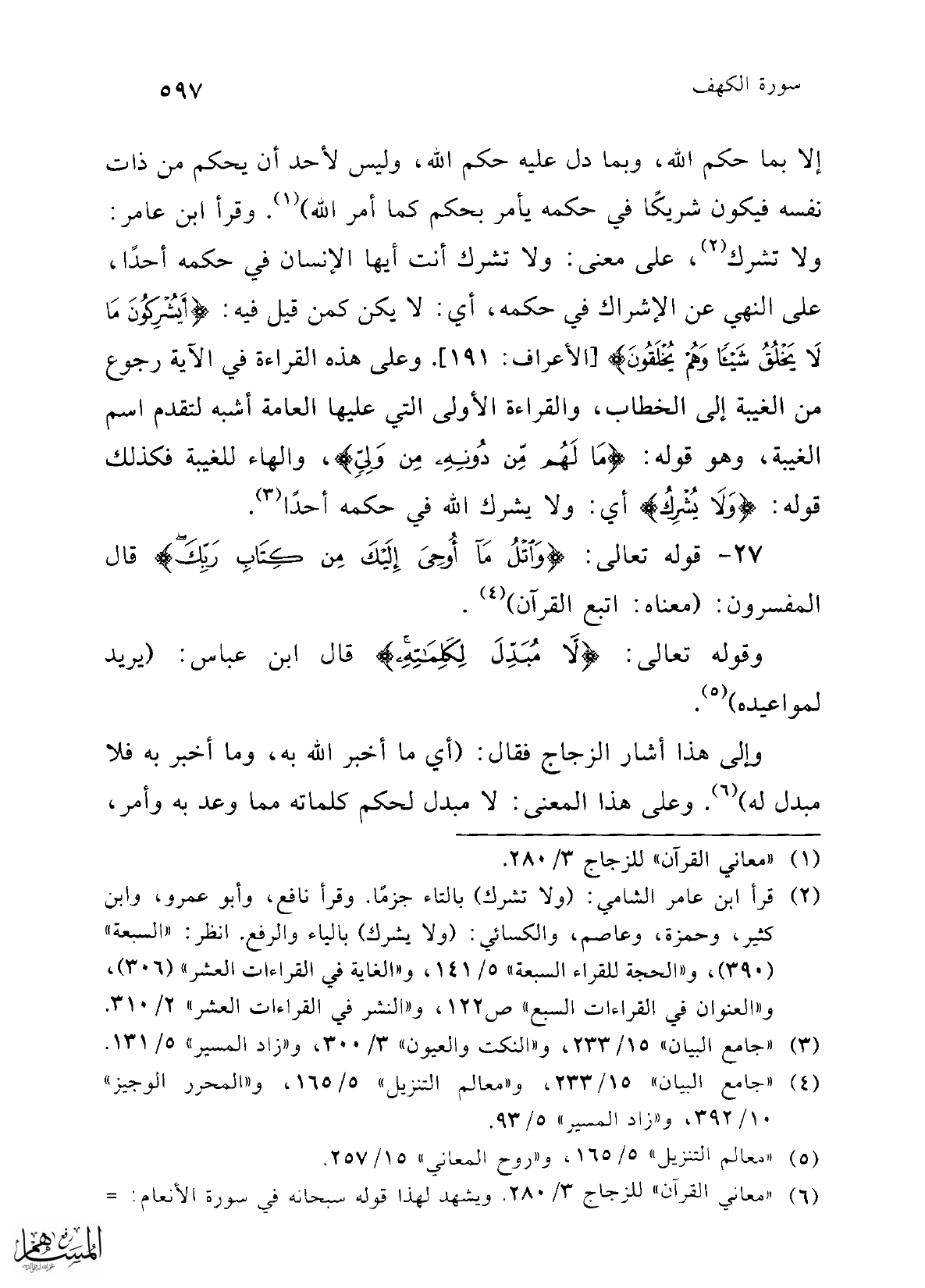 إلا بما حكم الله، وبما دل عليه حكم الله، وليس لأحد أن يحكم من ذات نفسه فيكون شريكًا في حكمه يأمر بحكم كما أمر الله) (¬1). وقرأ ابن عامر: ولا تشرك (¬2)، على معنى: ولا تشرك أنت أيها الإنسان في حكمه أحدًا، على النهي عن الإشراك في حكمه، أي: لا يكن كمن قيل فيه: {أَيُشْرِكُونَ مَا لَا يَخْلُقُ شَيْئًا وَهُمْ يُخْلَقُونَ)} [الأعراف: 191]. وعلى هذه القراءة في الآية رجوع من الغيبة إلى الخطاب، والقراءة الأولى التي عليها العامة أشبه لتقدم اسم الغيبة، وهو قوله: {مَا لَهُمْ مِنْ دُونِهِ مِنْ وَلِيٍّ}، والهاء للغيبة فكذلك قوله: {وَلَا يُشْرِكُ} أي: ولا يشرك الله في حكمه أحدًا (¬3).