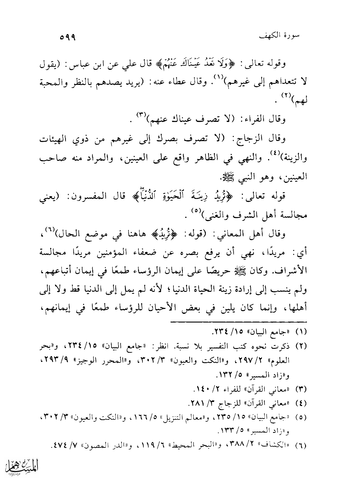 وقال أهل المعاني: (قوله: {تُرِيدُ} هاهنا في موضع الحال) (¬6)، أي: مريدًا، نهي أن يرفع بصره عن ضعفاء المؤمنين مريدًا مجالسة الأشراف. وكان -صلى الله عليه وسلم- حريصًا على إيمان الرؤساء طمعًا في إيمان أتباعهم، ولم ينسب إلى إرادة زينة الحياة الدنيا؛ لأنه لم يمل إلى الدنيا قط ولا إلى أهلها، وإنما كان يلين في بعض الأحيان للرؤساء طمعًا في إيمانهم،