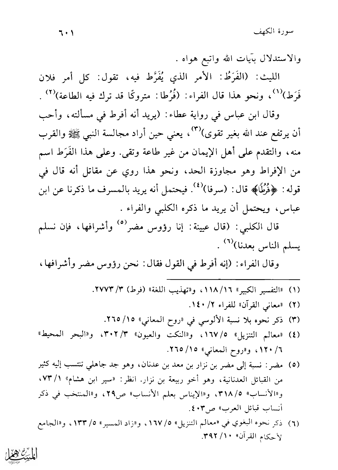 (¬1) "التفسير الكبير" 16/ 118، و"تهذيب اللغة" (فرط) 3/ 2773.