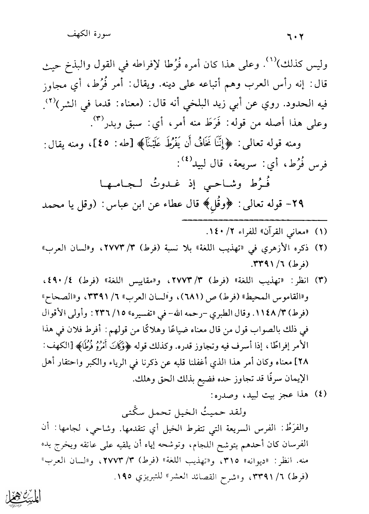(¬3) انظر: "تهذيب اللغة" (فرط) 3/ 2773، و"مقاييس اللغة" (فرط) 4/ 490، و"القاموس المحيط" (فرط) ص (681)، و"لسان العرب" 6/ 3391، و"الصحاح" (فرط) 3/ 1148. وقال الطبري -رحمه الله- في "تفسيره" 15/ 236: وأولى الأقوال في ذلك بالصواب قول من قال معناه ضياعًا وهلاكًا من قولهم: أفرط فلان في هذا الأمر إفراطًا، إذا أسرف فيه وتجاوز قدره. وكذلك قوله {وَكَانَ أَمْرُهُ فُرُطًا} [الكهف: 28]، معناه وكان أمر هذا الذي أغفلنا قلبه عن ذكرنا في الرياء والكبر واحتقار أهل الإيمان سرفًا قد تجاوز حده فضيع بذلك الحق وهلك.