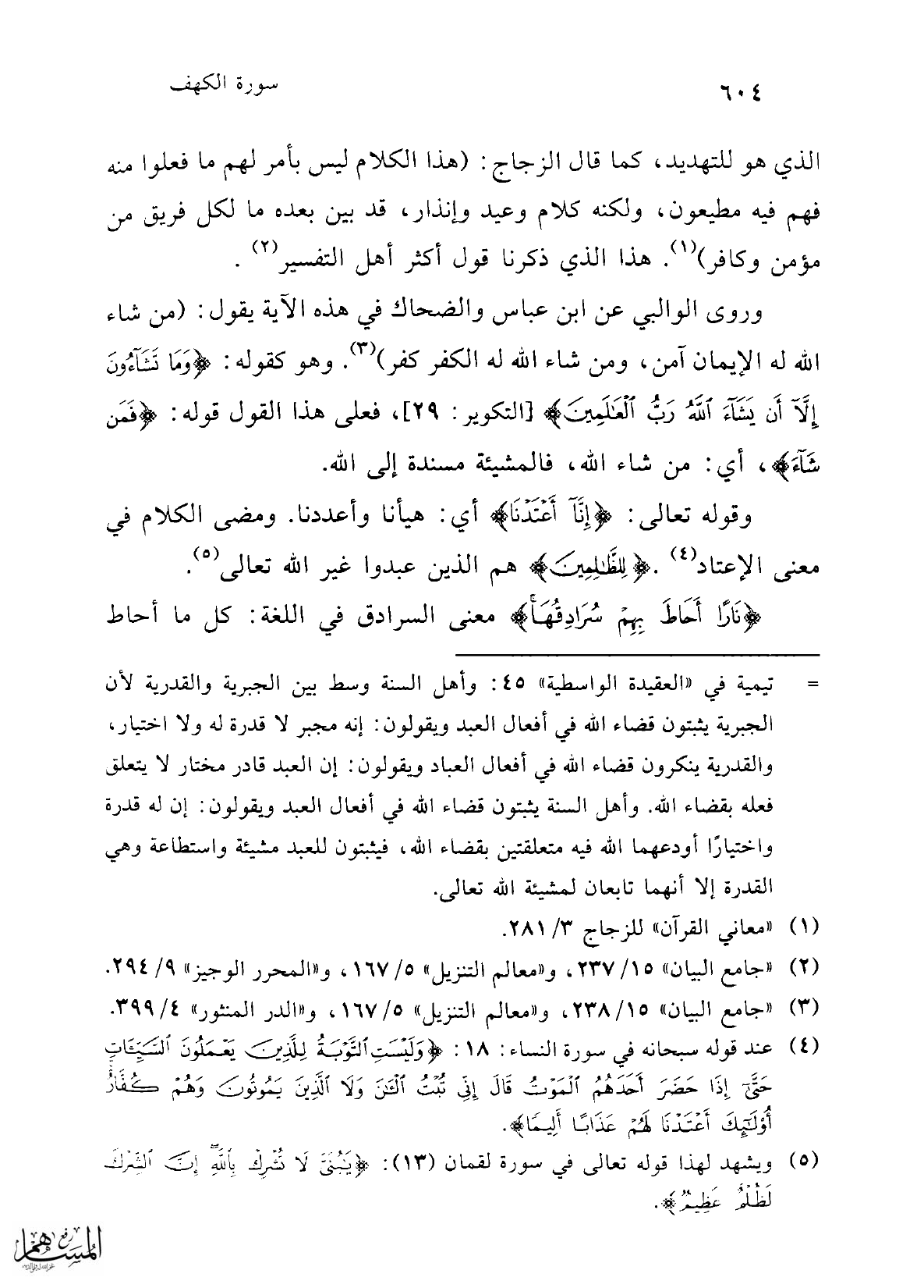 = تيمية في "العقيدة الواسطية" 45: وأهل السنة وسط بين الجبرية والقدرية لأن الجبرية يثبتون قضاء الله في أفعال العبد ويقولون: إنه مجبر لا قدرة له ولا اختيار، والقدرية ينكرون قضاء الله في أفعال العباد ويقولون: إن العبد قادر مختار لا يتعلق فعله بقضاء الله. وأهل السنة يثبتون قضاء الله في أفعال العبد ويقولون: إن له قدرة واختيارًا أودعهما الله فيه متعلقتين بقضاء الله، فيثبتون للعبد مشيئة واستطاعة وهي القدرة إلا أنهما تابعان لمشيئة الله تعالى.
