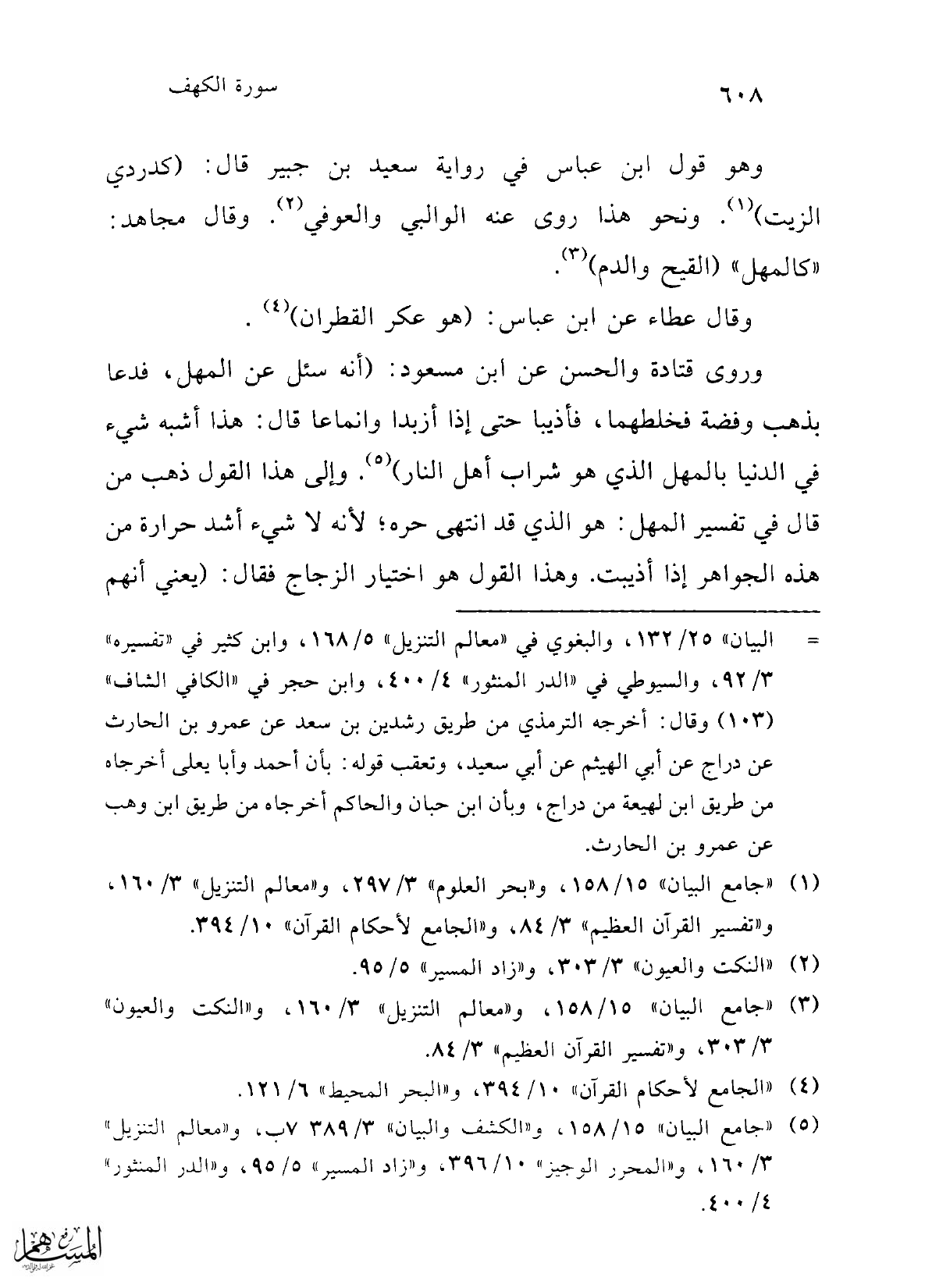 وروى قتادة والحسن عن ابن مسعود: (أنه سئل عن المهل، فدعا بذهب وفضة فخلطهما، فأذيبا حتى إذا أزبدا وانماعا قال: هذا أشبه شيء في الدنيا بالمهل الذي هو شراب أهل النار) (¬5). وإلى هذا القول ذهب من قال في تفسير المهل: هو الذي قد انتهى حره؛ لأنه لا شيء أشد حرارة من هذه الجواهر إذا أذيبت. وهذا القول هو اختيار الزجاج فقال: (يعني أنهم
