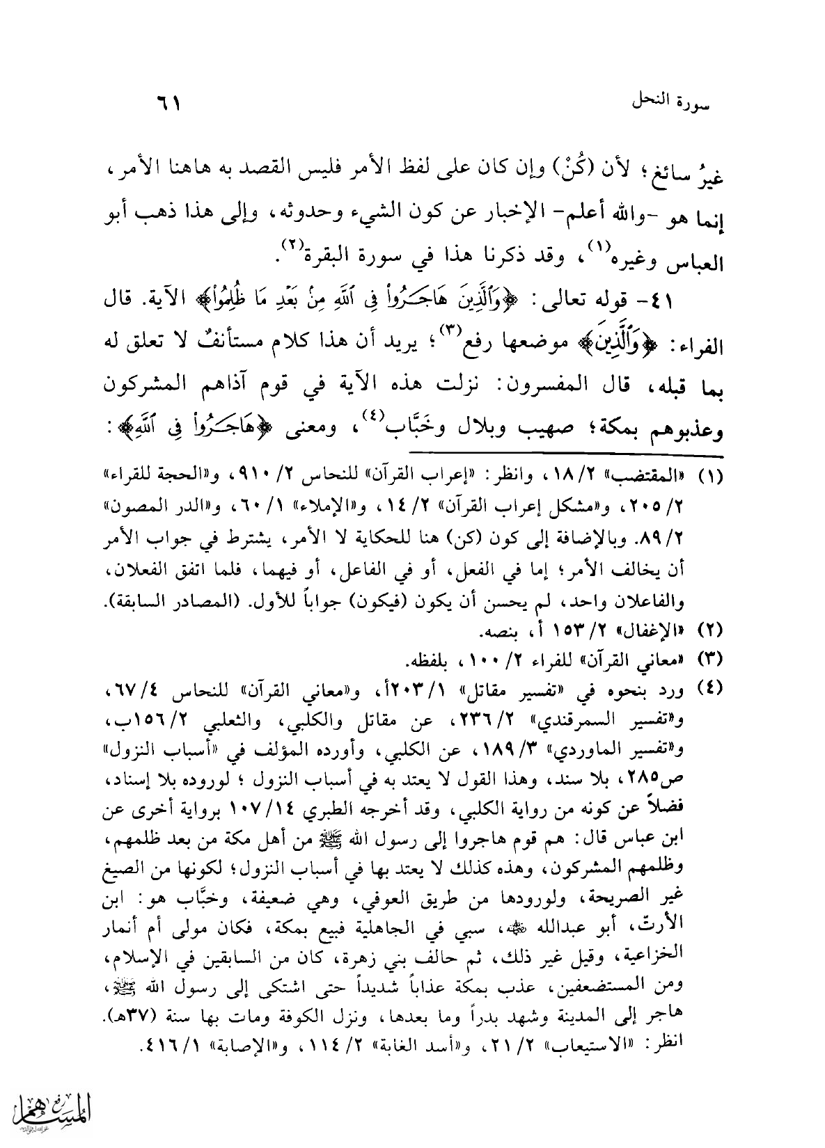 41 - قوله تعالى: {وَالَّذِينَ هَاجَرُوا فِي اللَّهِ مِنْ بَعْدِ مَا ظُلِمُوا} الآية. قال الفراء: {وَالَّذِينَ} موضعها رفع (¬3)؛ يريد أن هذا كلام مستأنفٌ لا تعلق له ما قبله، قال المفسرون: نزلت هذه الآية في قوم آذاهم المشركون وعذبوهم بمكة؛ صهيب وبلال وخَبَّاب (¬4)، ومعنى {هَاجَرُوا فِي اللَّهِ}: