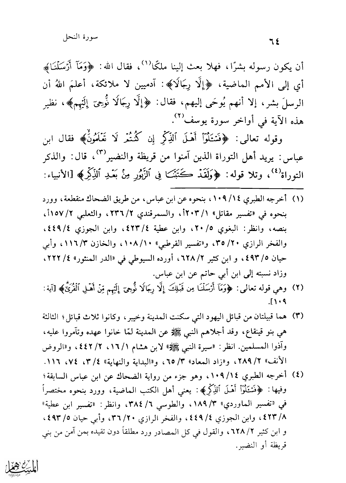 (¬4) أخرجه الطبري 14/ 109، وهو جزء من رواية الضحاك عن ابن عباس السابقة؛ وفيها: {فَاسْأَلُوا أَهْلَ الذِّكْرِ}: يعني أهل الكتب الماضية، وورد بنحوه مختصرًا في "تفسير الماوردي" 3/ 189، والطوسىِ 6/ 384، وانظر: "تفسير ابن عطية" 8/ 423، وابن الجوزي 4/ 449، والفخر الرازي 20/ 36، وأبي حيان 5/ 493، وابن كثير 2/ 628، والقول في كل المصادر ورد مطلقًا دون تقيده بمن آمن من بني قريظة أو النضير.