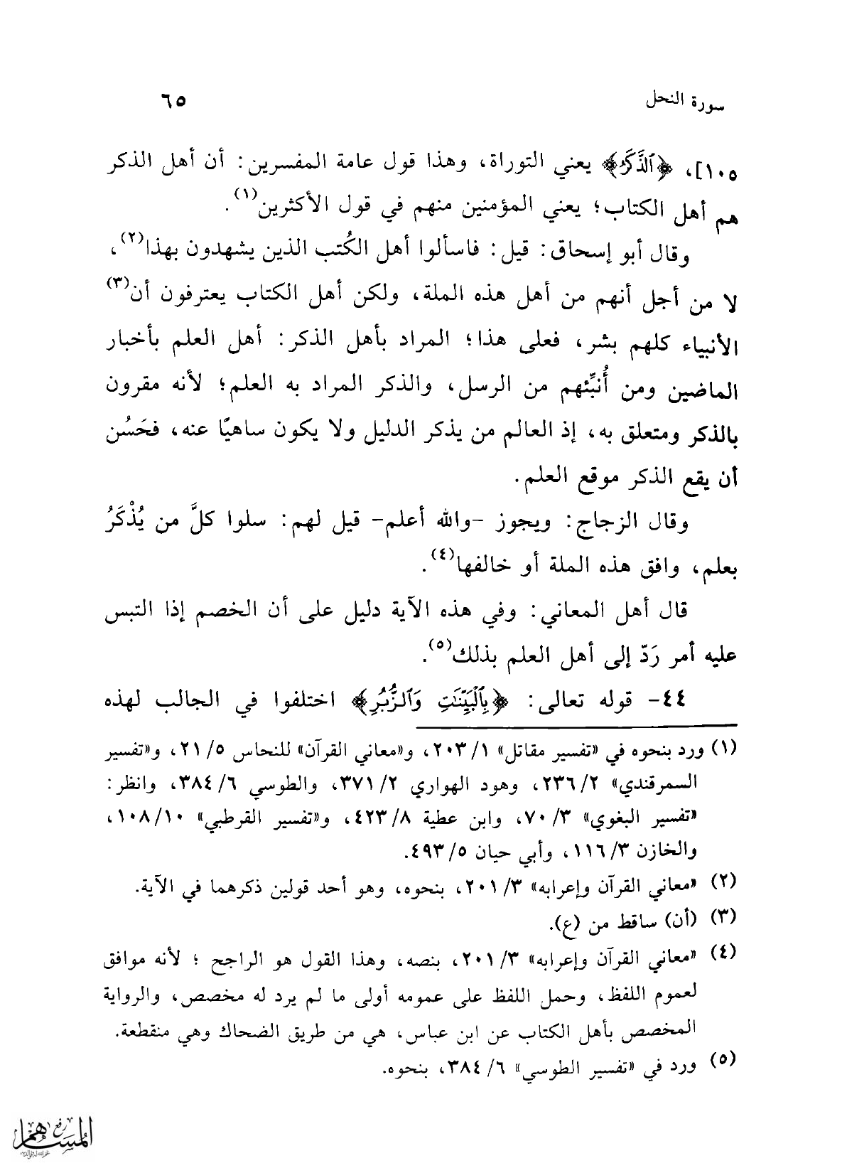 105]، {الذِّكْرِ} يعني التوراة، وهذا قول عامة المفسرين: أن أهل الذكر هم أهل الكتاب؛ يعني المؤمنين منهم في قول الأكثرين (¬1).