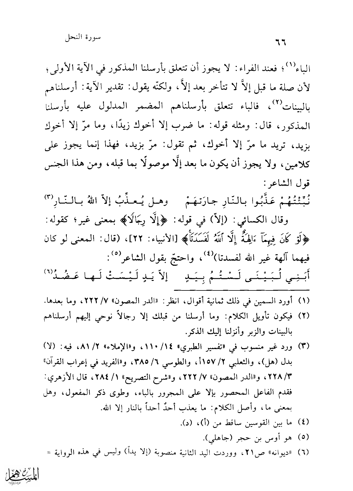 الباء (¬1)؛ فعند الفراء: لا يجوز أن تتعلق بأرسلنا المذكور في الآية الأولى؛ لأن صلة ما قبل إلاَّ لا تتأخر بعد إلاَّ، ولكنّه يقول: تقدير الآية: أرسلناهم بالبينات (¬2)، فالباء تتعلق بأرسلناهم المضمر المدلول عليه بأرسلنا المذكور، قال: ومثله قوله: ما ضرب إلا أخوك زيدًا، وما مرّ إلا أخوك يزيد، تريد ما مرّ إلا أخوك، ثم تقول: مرّ يزيد، فهذا إنما يجوز على كلامين، ولا يجوز أن يكون ما بعد إلاَّ موصولاً بما قبله، ومن هذا الجنس قول الشاعر: