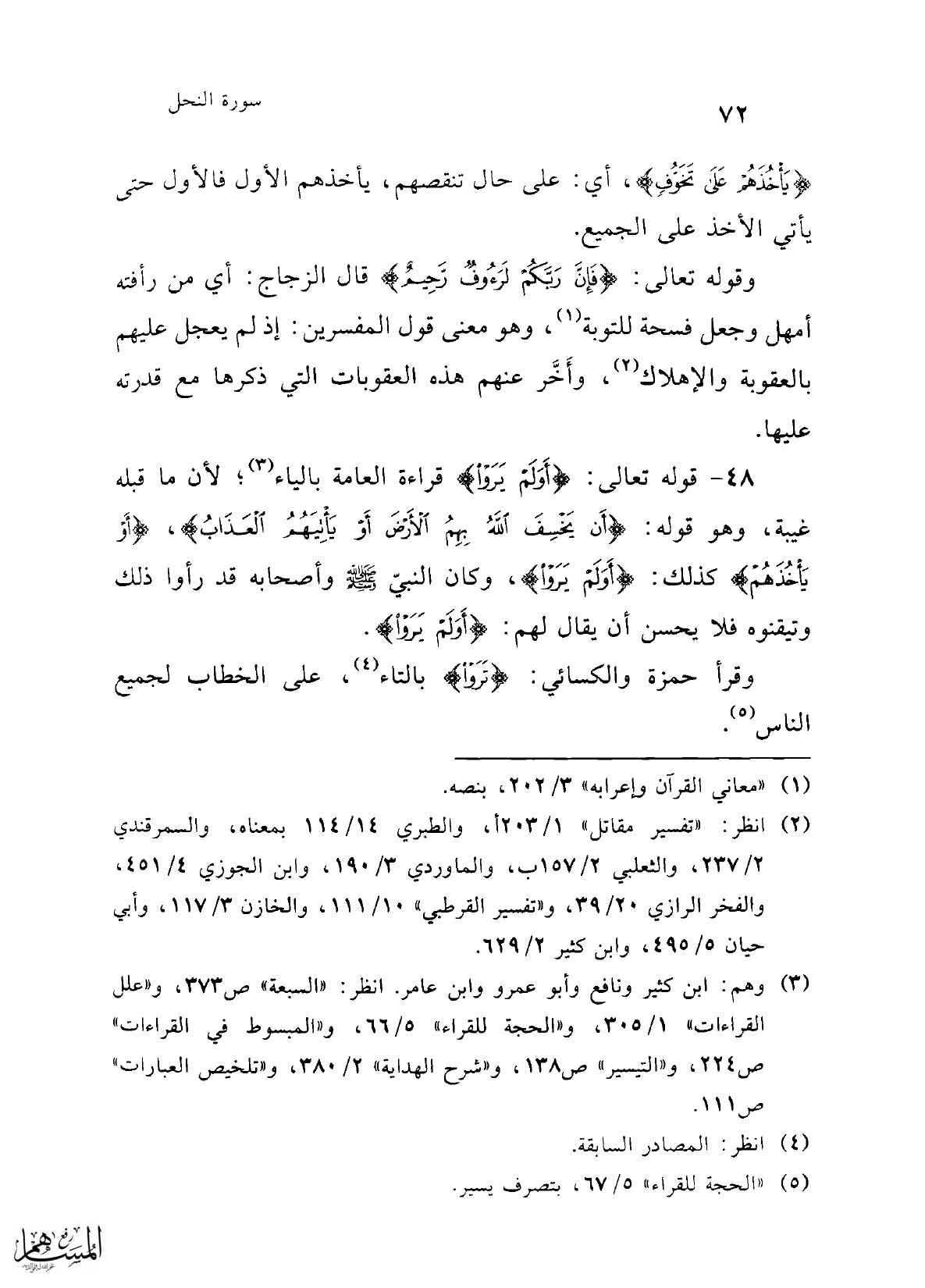 48 - قوله تعالى: {أَوَلَمْ يَرَوْا} قراءة العامة بالياء (¬3)؛ لأن ما قبله غيبة، وهو قوله: {أَنْ يَخْسِفَ اللَّهُ بِهِمُ الْأَرْضَ أَوْ يَأْتِيَهُمُ الْعَذَابُ}، {أَوْ يَأْخُذَهُمْ} كذلك: {أَوَلَمْ يَرَوْا}، وكان النبيّ -صلى الله عليه وسلم- وأصحابه قد رأوا ذلك وتيقنوه فلا يحسن أن يقال لهم: {أَوَلَمْ يَرَوْا}.