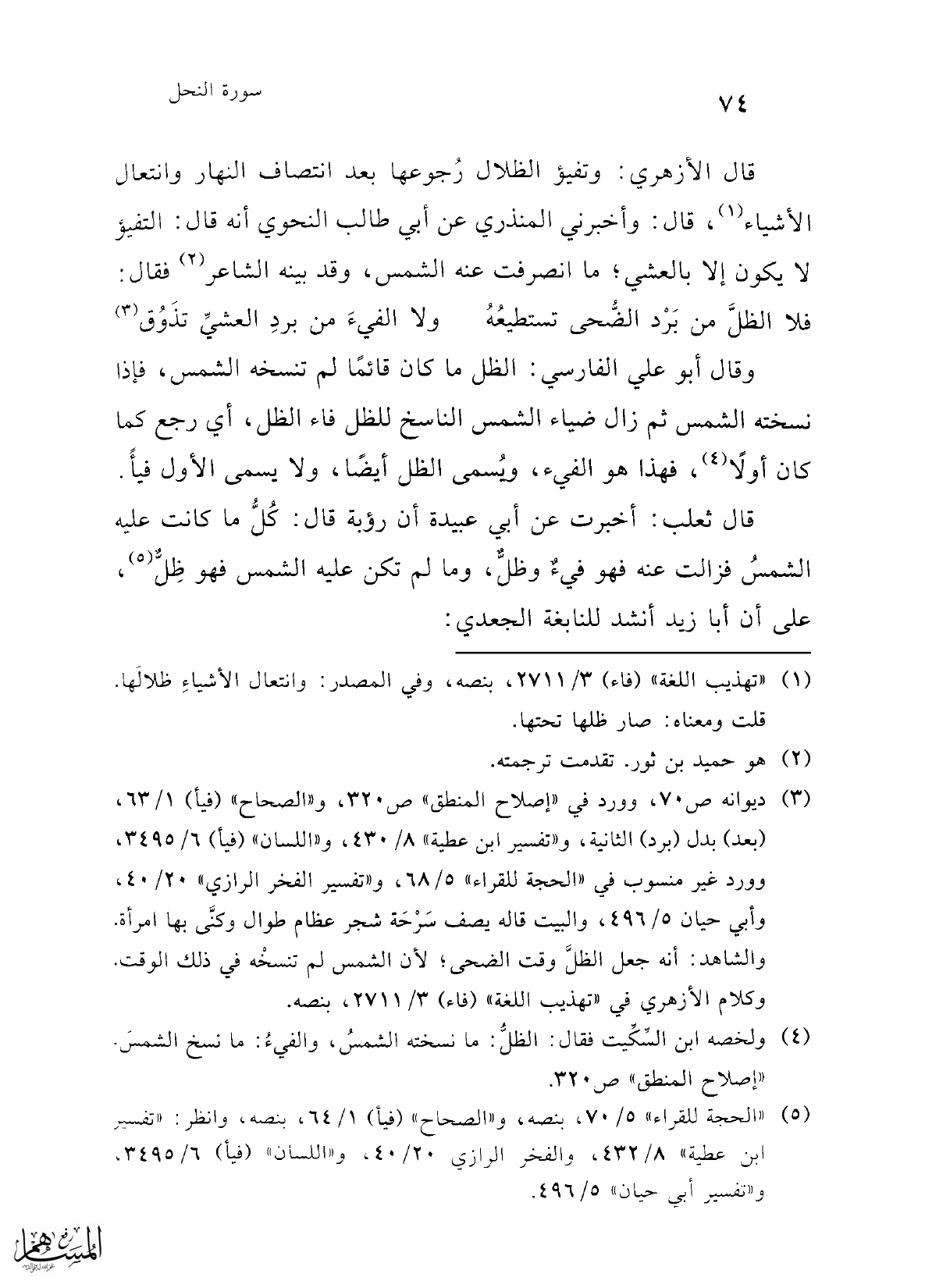 (¬5) "الحجة للقراء" 5/ 70، بخصه، و"الصحاح" (فيأ) 1/ 64، بنصه، وانظر: "تفسير ابن عطية" 8/ 432، والفخر الرازي 20/ 40 , و"اللسان" (فيأ) 6/ 3495 , و"تفسير أبى حيان" 5/ 496.