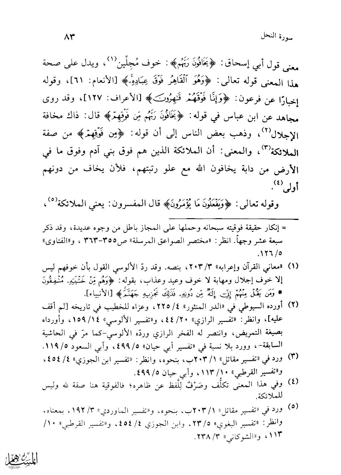 (¬4) وفي هذا المعنى تكلُّف وصَرْفٌ لِلَّفظ عن ظاهره؛ فالفوقية هنا صفة لله وليس للملائكة.