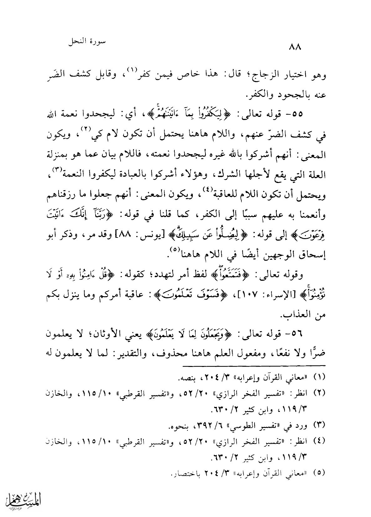 55 - قوله تعالى: {لِيَكْفُرُوا بِمَا آتَيْنَاهُمْ}، أي: ليجحدوا نعمة الله في كشف الضرّ عنهم، واللام هاهنا يحتمل أن تكون لام كي (¬2)، ويكون المعنى: أنهم أشركوا بالله غيره ليجحدوا نعمته، فاللام بيان عما هو بمنزلة العلة التي يقع لأجلها الشرك، وهؤلاء أشركوا بالعبادة ليكفروا النعمة (¬3)، ويحتمل أن تكون اللام للعاقبة (¬4)، ويكون المعنى: أنهم جعلوا ما رزقناهم وأنعمنا به عليهم سببًا إلى الكفر، كما قلنا في قوله: {رَبَّنَا إِنَّكَ آتَيْتَ فِرْعَوْنَ} إلى قوله: {لِيُضِلُّوا عَنْ سَبِيلِكَ} [يونس: 88]، وقد مر، وذكر أبو إسحاق الوجهين أيضًا في اللام هاهنا (¬5).