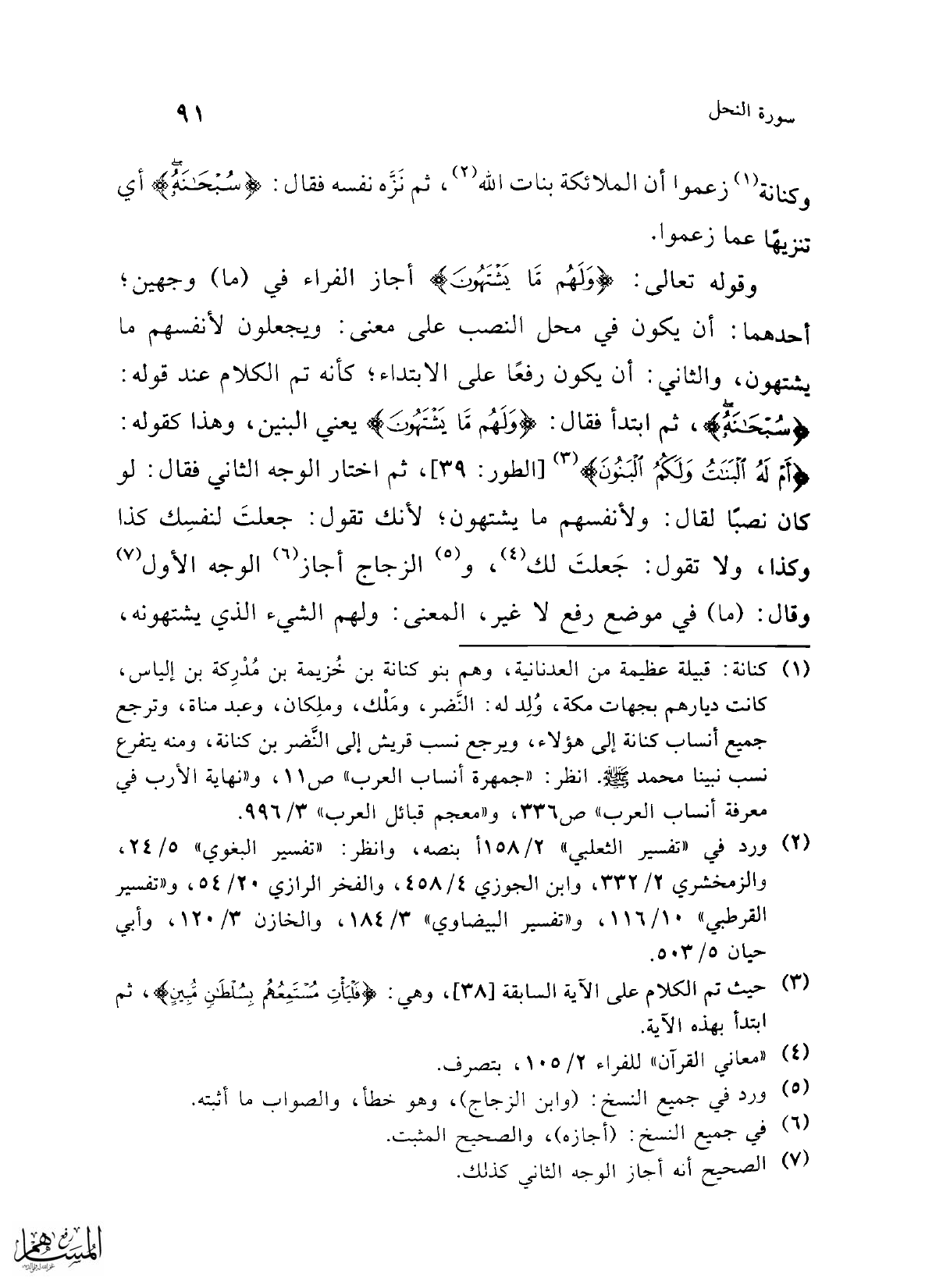وقوله تعالى: {وَلَهُمْ مَا يَشْتَهُونَ} أجاز الفراء في (ما) وجهين؛ أحدهما: أن يكون في محل النصب على معنى: ويجعلون لأنفسهم ما يشتهون، والثاني: أن يكون رفعًا على الابتداء؛ كأنه تم الكلام عند قوله: {سُبْحَانَهُ}، ثم ابتدأ فقال: {وَلَهُمْ مَا يَشْتَهُونَ} يعني البنين، وهذا كقوله: {أَمْ لَهُ الْبَنَاتُ وَلَكُمُ الْبَنُونَ} (¬3) [الطور: 39] , ثم اختار الوجه الثاني فقال: لو كان نصبًا لقال: ولأنفسهم ما يشتهون؛ لأنك تقول: جعلتَ لنفسِك كذا وكذا, ولا تقول: جَعلتَ لك (¬4)، و (¬5) الزجاج أجاز (¬6) الوجه الأول (¬7) وقال: (ما) في موضع رفع لا غير، المعنى: ولهم الشيء الذي يشتهونه،