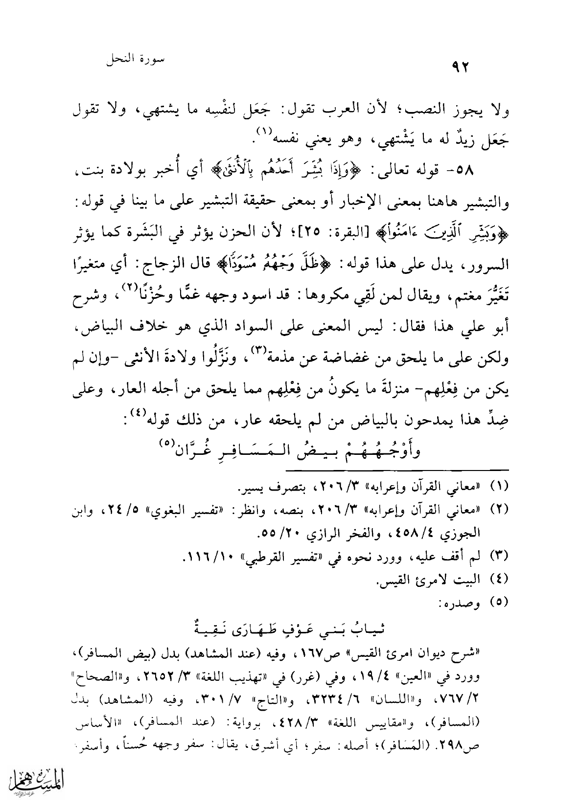 58 - قوله تعالى: {وَإِذَا بُشِّرَ أَحَدُهُمْ بِالْأُنْثَى} أي أُخبر بولادة بنت، والتبشير هاهنا بمعنى الإخبار أو بمعنى حقيقة التبشير على ما بينا في قوله: {وَبَشِّرِ الَّذِينَ آمَنُوا} [البقرة: 25]؛ لأن الحزن يؤثر في البَشَرة كما يؤثر السرور، يدل على هذا قوله: {ظَلَّ وَجْهُهُ مُسْوَدًّا} قال الزجاج: أي متغيرًا تَغَيُّرَ مغتم، ويقال لمن لَقِي مكروها: قد اسود وجهه غمَّا وحُزْنًا (¬2)، وشرح أبو علي هذا فقال: ليس المعنى على السواد الذي هو خلاف البياض، ولكن على ما يلحق من غضاضة عن مذمة (¬3)، ونَزَّلُوا ولادةَ الأنثى -وإن لم يكن من فِعْلِهم- منزلةَ ما يكونُ من فِعْلِهم مما يلحق من أجله العار، وعلى ضِدِّ هذا يمدحون بالبياض من لم يلحقه عار، من ذلك قوله (¬4):