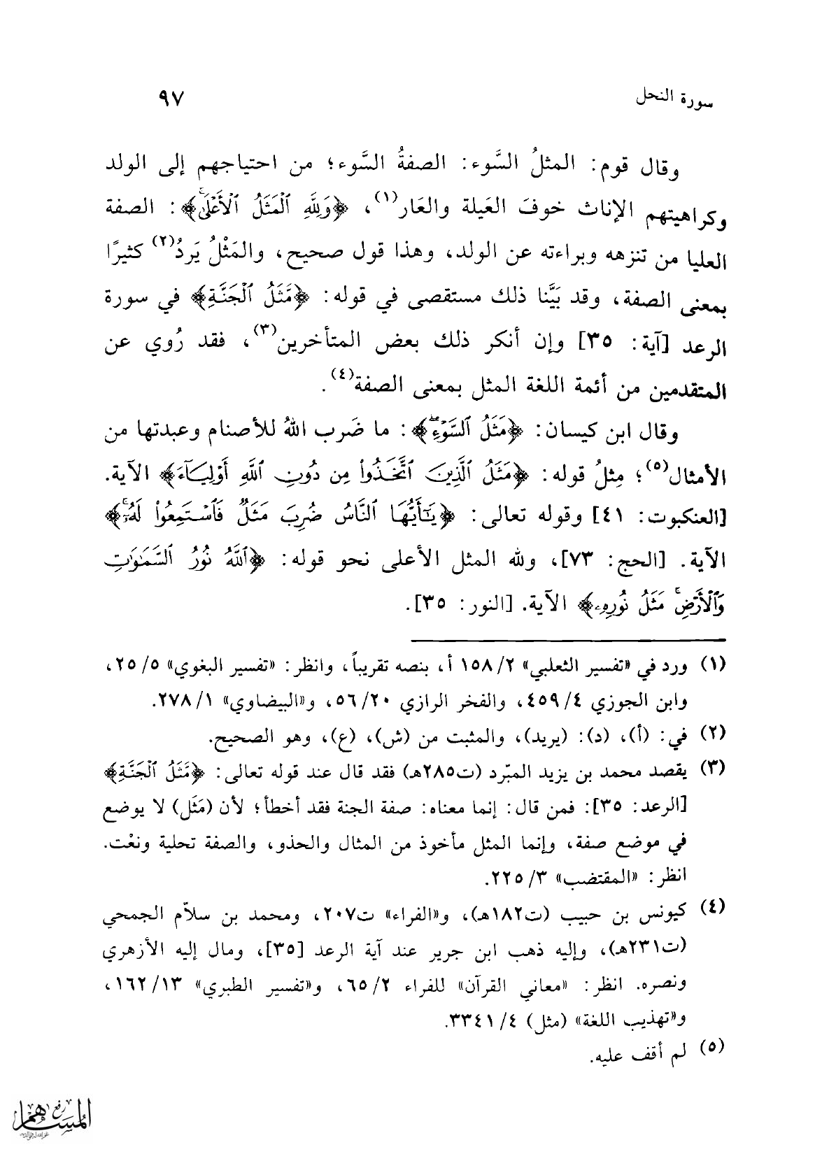 (¬3) يقصد محمد بن يزيد المبّرد (ت 285 هـ) فقد قال عند قوله تعالى: {مَثَلُ الْجَنَّةِ} [الرعد: 35]: فمن قال: إنما معناه: صفة الجنة فقد أخطأ؛ لأن (مَثَل) لا يوضع في موضح صفة، وإنما المثل مأخوذ من المثال والحذو، والصفة تحلية ونعْت. انظر: "المقتضب" 3/ 225.