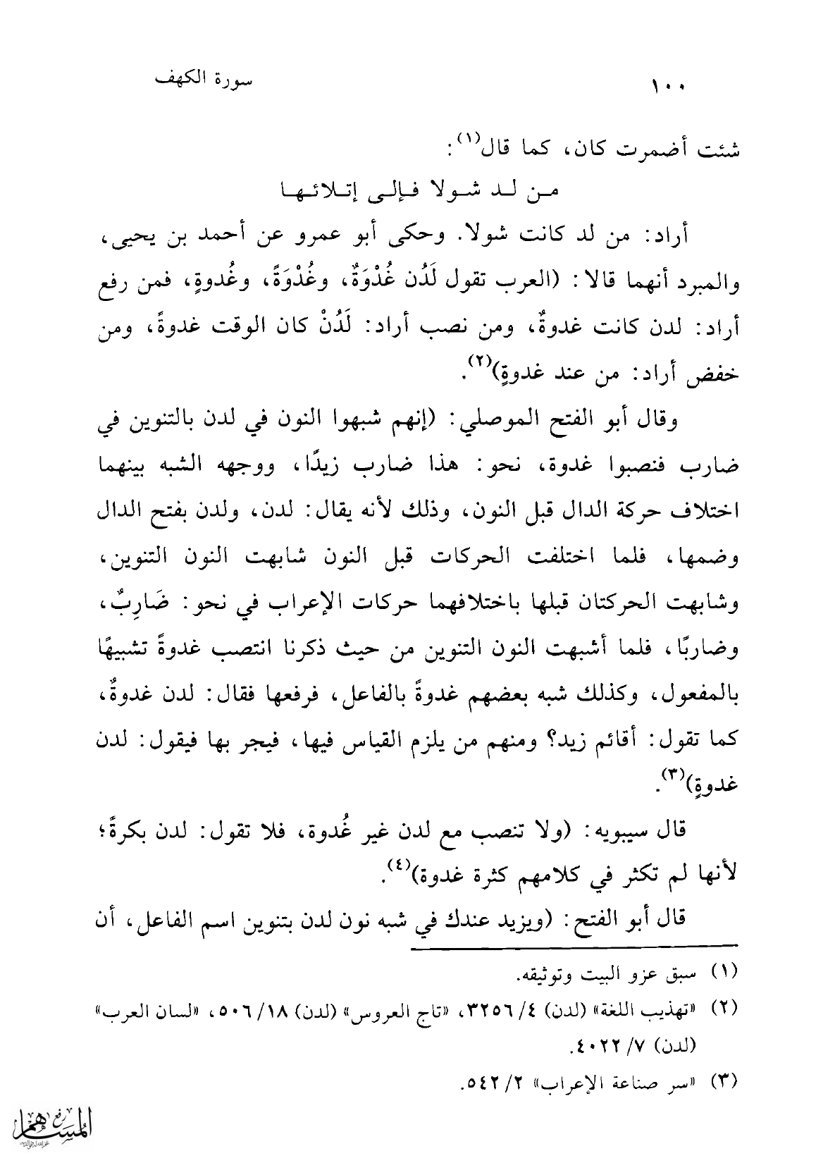 وقال أبو الفتح الموصلي: (إنهم شبهوا النون في لدن بالتنوين في ضارب فنصبوا غدوة، نحو: هذا ضارب زيدًا، ووجهه الشبه بينهما اختلاف حركة الدال قبل النون، وذلك لأنه يقال: لدن، ولدن بفتح الدال وضمها، فلما اختلفت الحركات قبل النون شابهت النون التنوين، وشابهت الحركتان قبلها باختلافهما حركات الإعراب في نحو: ضَارِبٌ، وضاربًا، فلما أشبهت النون التنوين من حيث ذكرنا انتصب غدوةً تشبيهًا بالمفعول، وكذلك شبه بعضهم غدوةً بالفاعل، فرفعها فقال: لدن غدوةٌ، كما تقول: أقائم زيد؟ ومنهم من يلزم القياس فيها، فيجر بها فيقول: لدن غدوةٍ) (¬3).