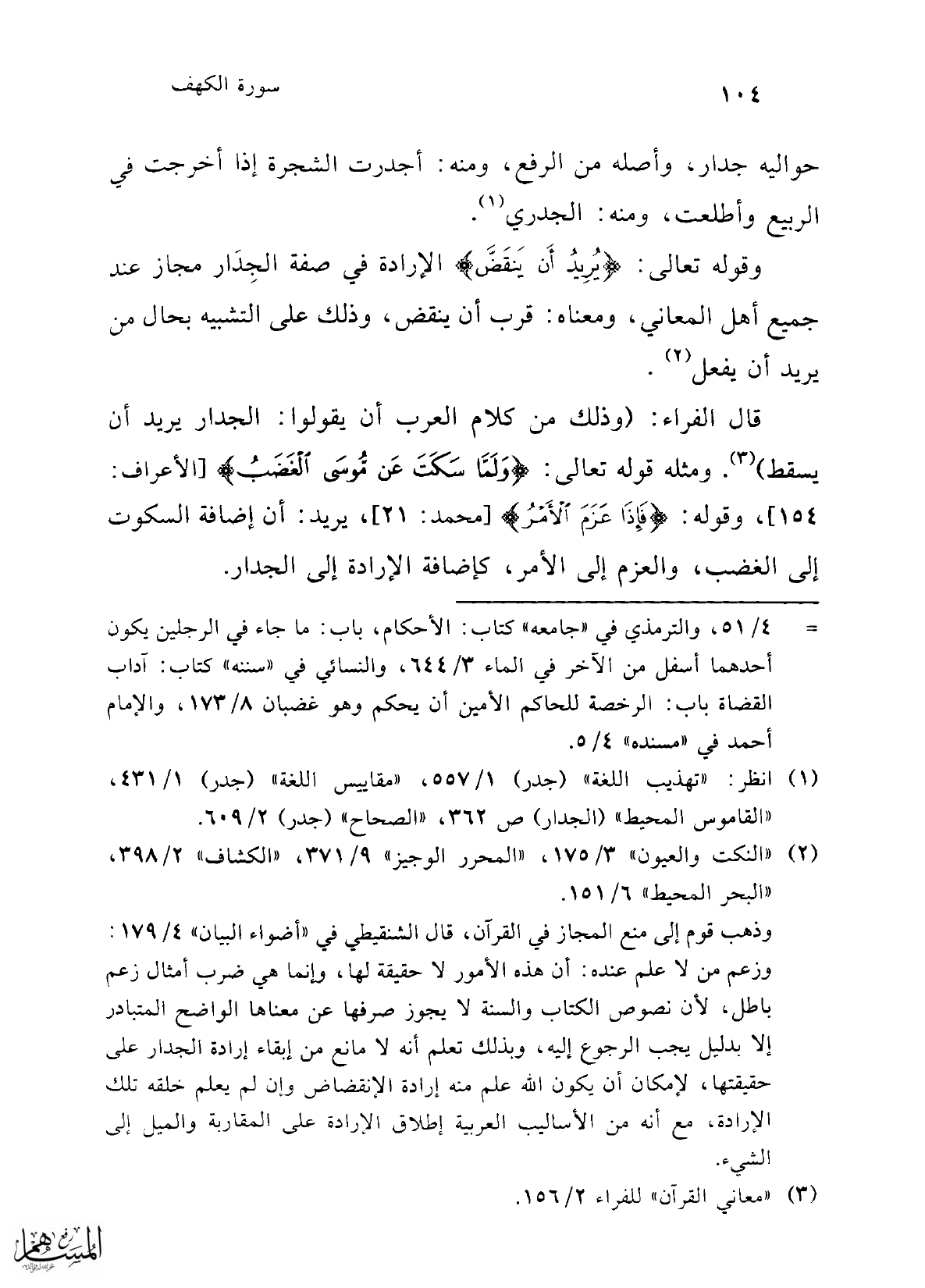 وذهب قوم إلى منع المجاز في القرآن، قال الشنقيطي في "أضواء البيان" 4/ 179: وزعم من لا علم عنده: أن هذه الأمور لا حقيقة لها، وإنما هي ضرب أمثال زعم باطل؛ لأن نصوص الكتاب والسنة لا يجوز صرفها عن معناها الواضح المتبادر إلا بدليل يجب الرجوع إليه، وبذلك تعلم أنه لا مانع من إبقاء إرادة الجدار على حقيقتها, لإمكان أن يكون الله علم منه إرادة الإنقضاض وإن لم يعلم خلقه تلك الإرادة، مع أنه من الأساليب العربية إطلاق في الإرادة على المقاربة والميل إلى الشيء.
