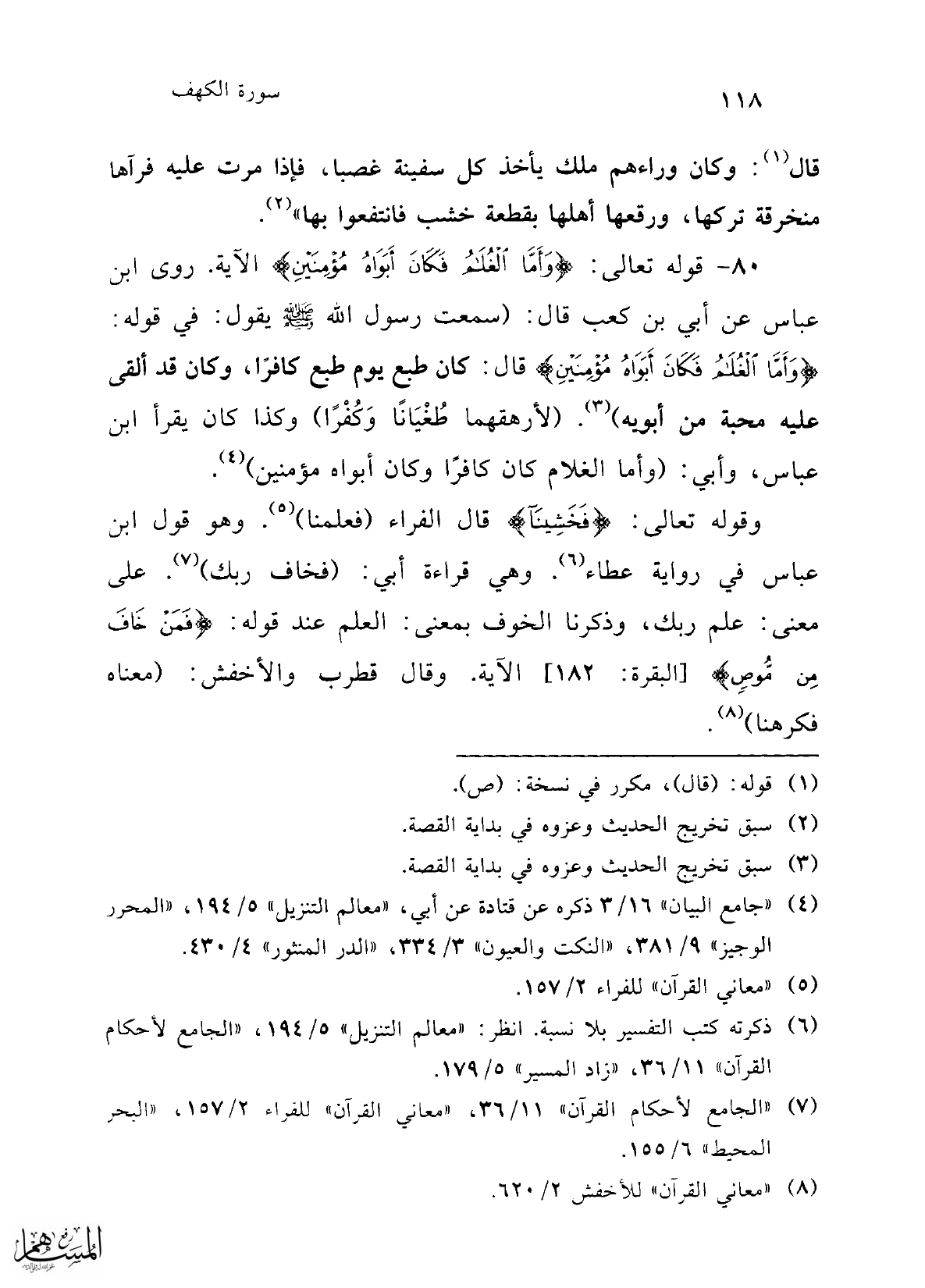 80 - قوله تعالى: {وَأَمَّا الْغُلَامُ فَكَانَ أَبَوَاهُ مُؤْمِنَيْنِ} الآية. روى ابن عباس عن أبي بن كعب قال: (سمعت رسول الله -صلى الله عليه وسلم- يقول: في قوله: {وَأَمَّا الْغُلَامُ فَكَانَ أَبَوَاهُ مُؤْمِنَيْنِ} قال: كان طبع يوم طبع كافرًا، وكان قد ألقى عليه محبة من أبويه) (¬3) (لأرهقهما طُغْيَانًا وَكُفْرًا) وكذا كان يقرأ ابن عباس، وأبي: (وأما الغلام كان كافرًا وكان أبواه مؤمنين) (¬4).