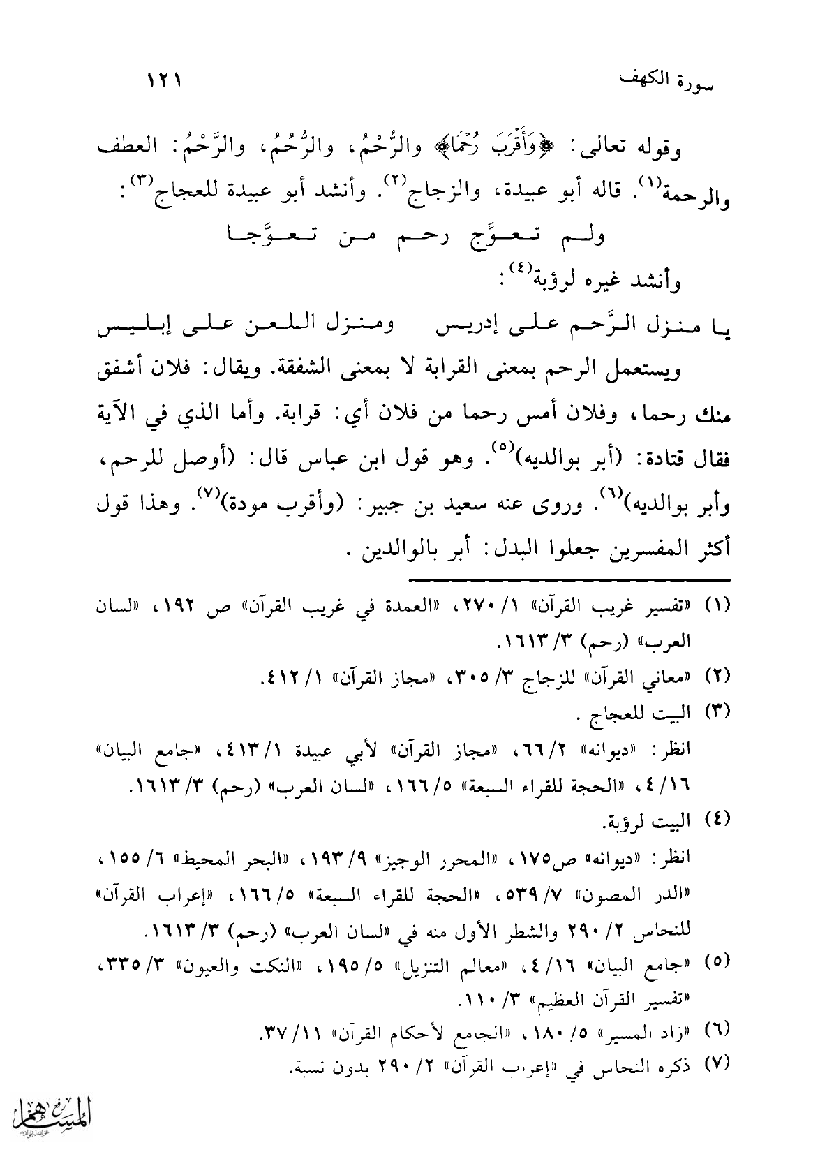 (¬1) "تفسير غريب القرآن" 1/ 270، "العمدة في غريب القرآن" ص 192، "لسان العرب" (رحم) 3/ 1613.