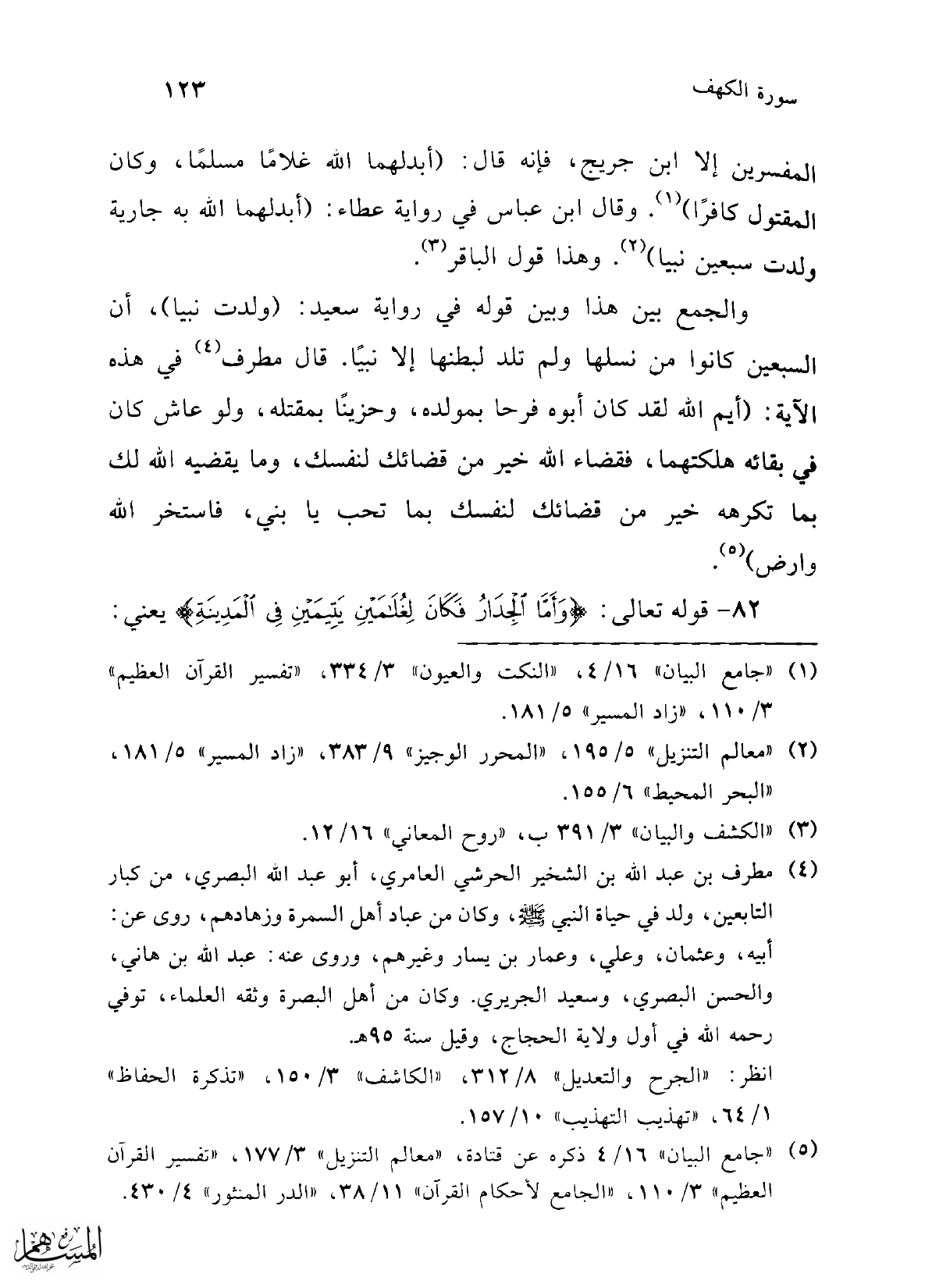 (¬2) "معالم التنزيل" 5/ 195، "المحرر الوجيز" 9/ 383، "زاد المسير" 5/ 181، "البحر المحيط" 6/ 155.