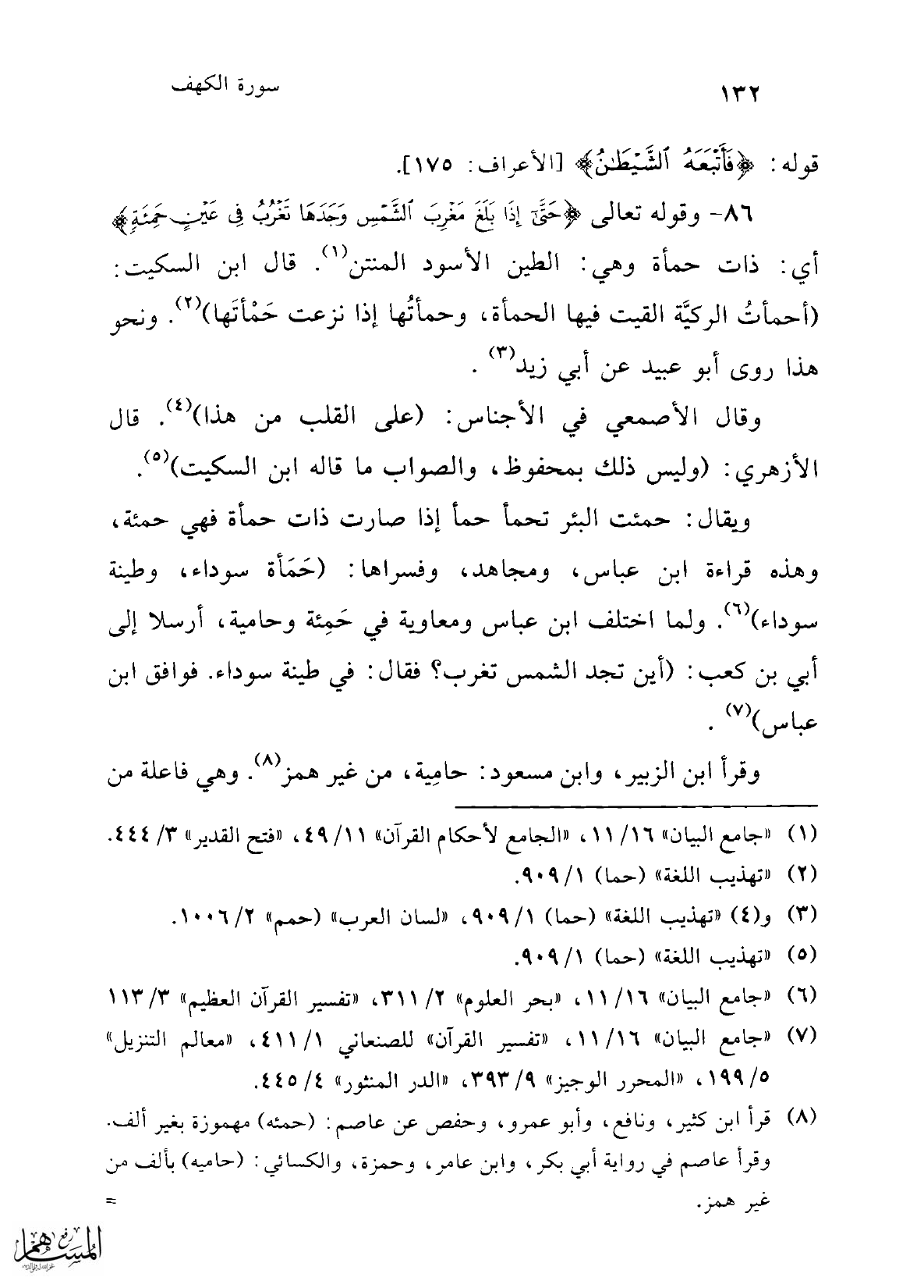 86 - وقوله تعالى {حَتَّى إِذَا بَلَغَ مَغْرِبَ الشَّمْسِ وَجَدَهَا تَغْرُبُ فِي عَيْنٍ حَمِئَةٍ} أي: ذات حمأة وهي: الطين الأسود المنتن (1). قال ابن السكيت: (أحمأتُ الركيَّة القيت فيها الحمأة، وحمأتُها إذا نزعت حَمْأتَها) (2). ونحو هذا روى أبو عبيد عن أبي زيد (3).