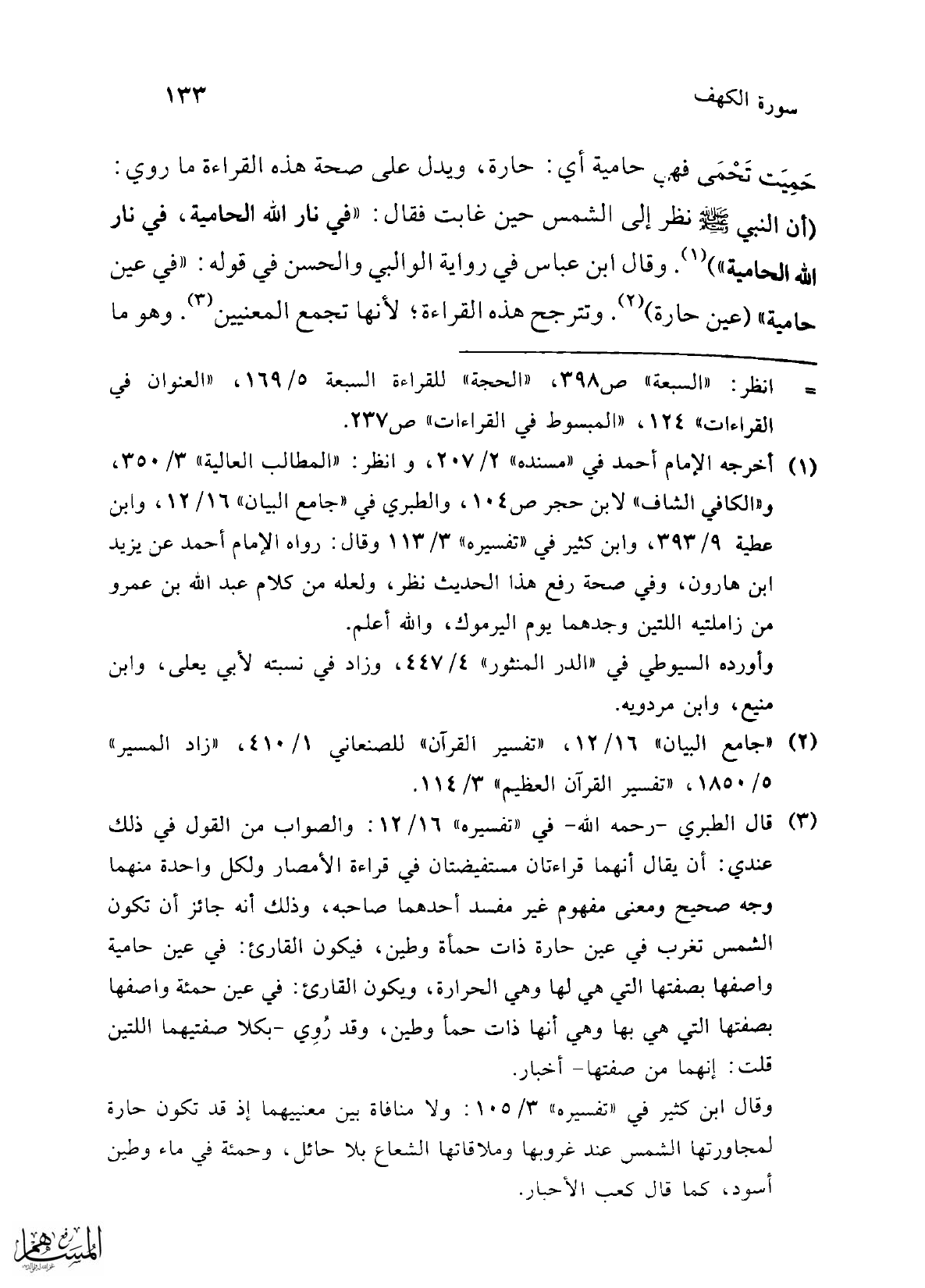 (¬3) قال الطبري -رحمه الله- في "تفسيره" 16/ 12: والصواب من القول في ذلك عندي: أن يقال أنهما قراءتان مستفيضتان في قراءة الأمصار ولكل واحدة منهما وجه صحيح ومعنى مفهوم غير مفسد أحدهما صاحبه، وذلك أنه جائز أن تكون الشمس تغرب في عين حارة ذات حمأة وطين، فيكون القارئ: في عين حامية واصفها بصفتها التي هي لها وهي الحرارة، ويكون القارئ: في عين حمئة واصفها بصفتها التي هي بها وهي أنها ذات حمأ وطين، وقد رُوِي -بكلا صفتيهما اللتين قلت: إنهما من صفتها- أخبار.