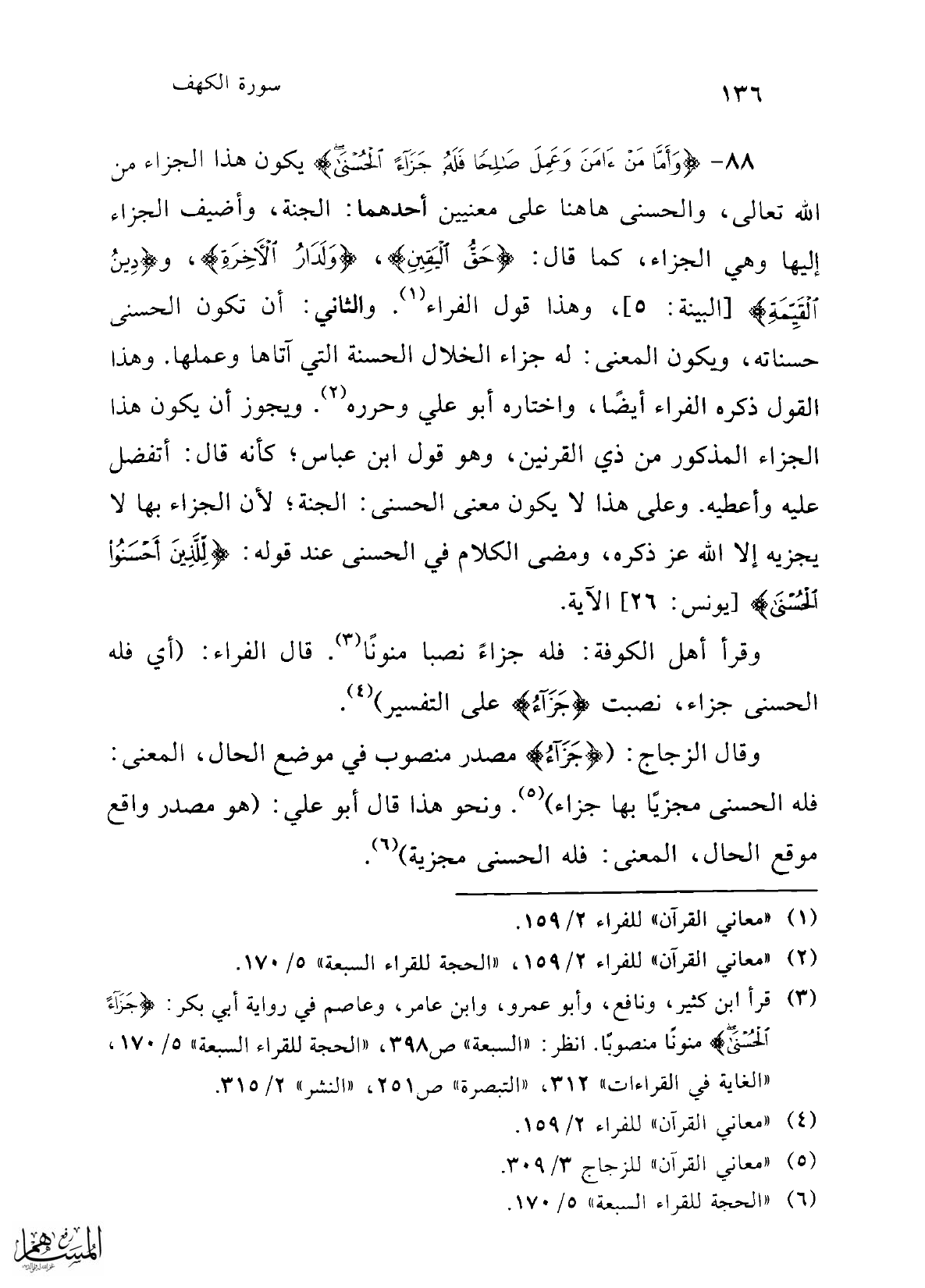 (¬3) قرأ ابن كثير، ونافع، وأبو عمرو، وابن عامر، وعاصم في رواية أبي بكر: {جَزَاءً الْحُسْنَى} منونًا منصوبًا. انظر: "السبعة" ص 398، "الحجة للقراء السبعة" 5/ 170، "الغاية في القراءات" 312، "التبصرة" ص 251، "النشر" 2/ 315.
