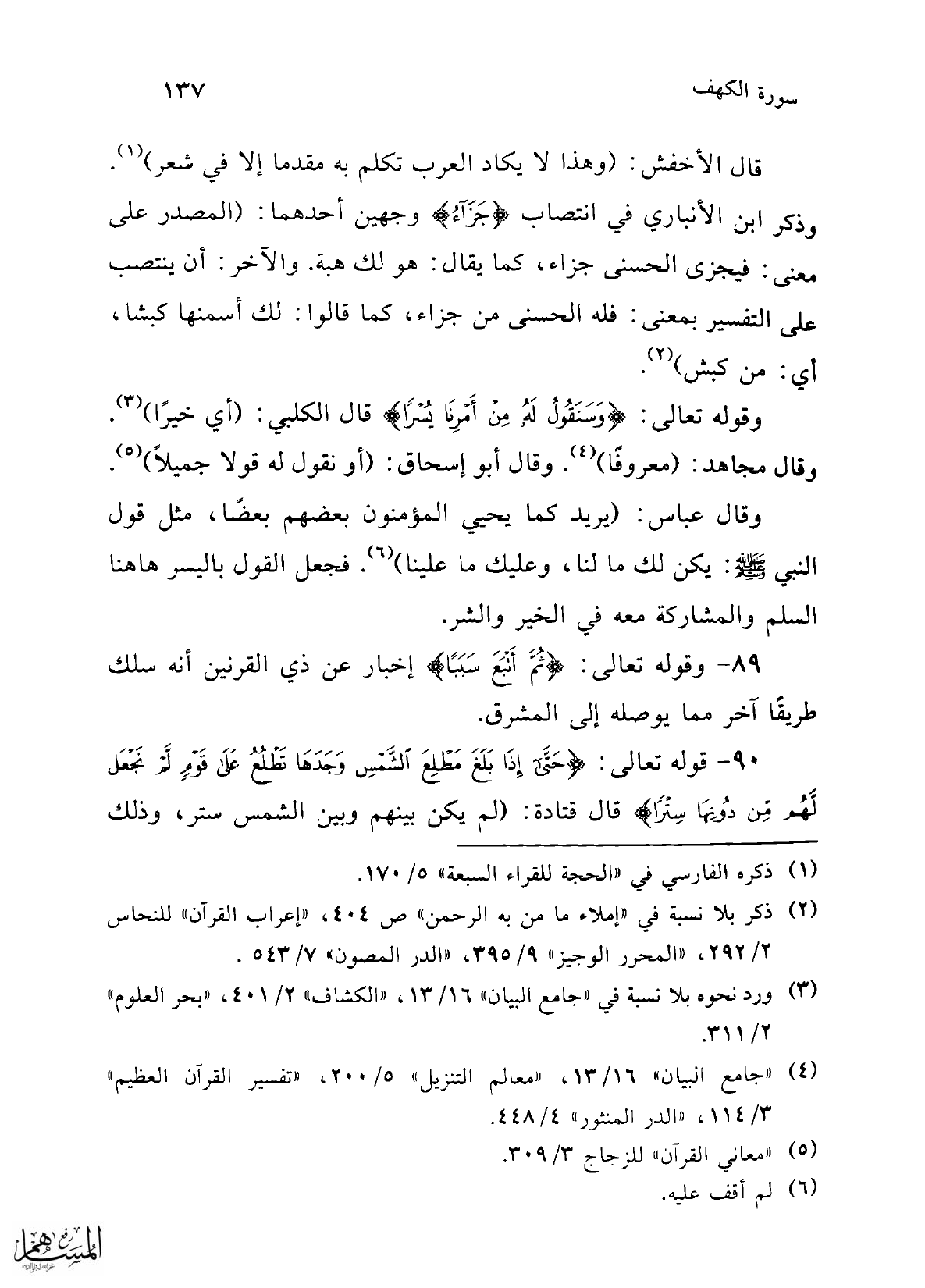 قال الأخفش: (وهذا لا يكاد العرب تكلم به مقدما إلا في شعر) (¬1). وذكر ابن الأنباري في انتصاب {جَزَاءً} وجهين أحدهما: (المصدر على معنى: فيجزى الحسنى جزاء، كما يقال: هو لك هبة. والآخر: أن ينتصب على التفسير بمعنى: فله الحسنى من جزاء، كما قالوا: لك أسمنها كبشا، أي: من كبش) (¬2).