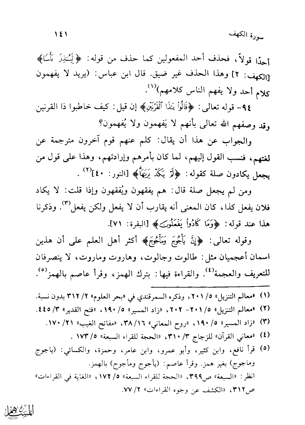 (¬5) قرأ نافع، وابن كثير، وأبو عمرو، وابن عامر، وحمزة، والكسائي: (ياجوج وماجوج) بغير همز. وقرأ عاصم: (يأجوج ومأجوح) بالهمز.