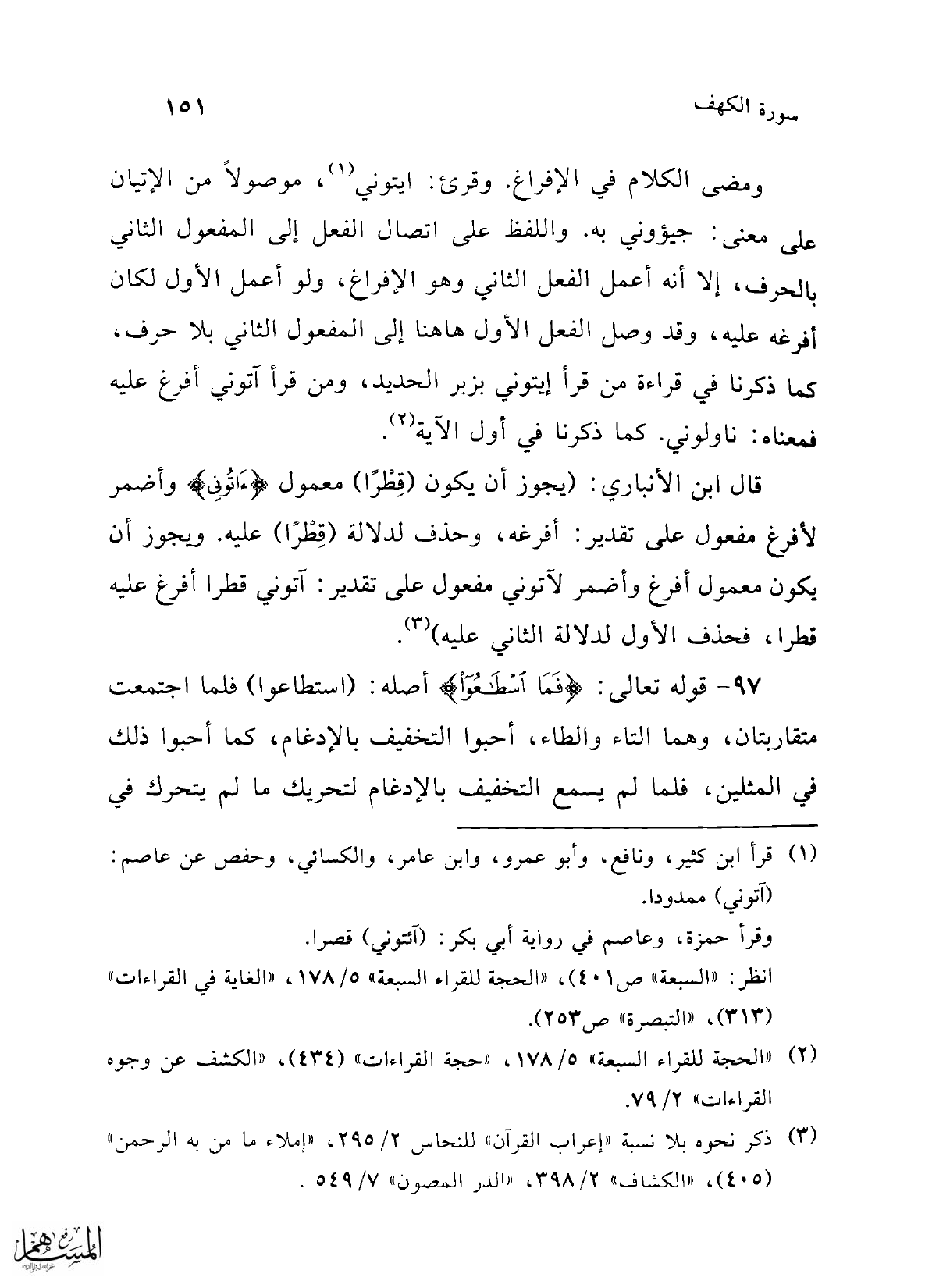 قال ابن الأنباري: (يجوز أن يكون (قِطْرًا) معمول {آتُونِي} وأضمر لأفرغ مفعول على تقدير: أفرغه، وحذف لدلالة (قِطْرًا) عليه. ويجوز أن يكون معمول أفرغ وأضمر لآتوني مفعول على تقدير: آتوني قطرا أفرغ عليه قطرا، فحذف الأول لدلالة الثاني عليه) (¬3).