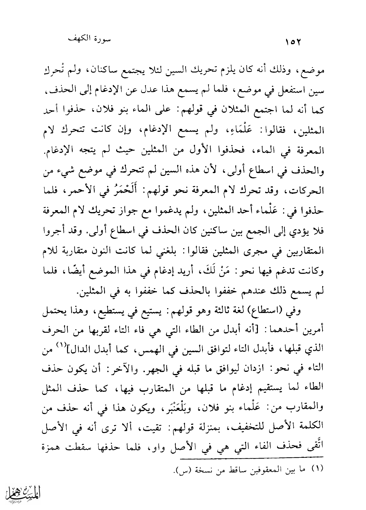 موضع، وذلك أنه كان يلزم تحريك السين لئلا يجتمع ساكنان، ولم تْحرك سين استفعل في موضع، فلما لم يسمع هذا عدل عن الإدغام إلى الحذف، كما أنه لما اجتمع المثلان في قولهم: على الماء بنو فلان، حذفوا أحد المثلين، فقالوا: عَلْمَاءِ، ولم يسمع الإدغام، وإن كانت تتحرك لام المعرفة في الماء، فحذفوا الأول من المثلين حيث لم يتجه الإدغام. والحذف في اسطاع أولى، لأن هذه السين لم تتحرك في موضع شيء من الحركات، وقد تحرك لام المعرفة نحو قولهم: أَلَحْمَرُ في الأحمر، فلما حذفوا في: عَلْماء أحد المثلين، ولم يدغموا مع جواز تحريك لام المعرفة فلا يؤدي إلى الجمع بين ساكنين كان الحذف في اسطاع أولى. وقد أجروا المتقاربين في مجرى المثلين فقالوا: بلغني لما كانت النون متقاربة للام وكانت تدغم فيها نحو: مَنْ لَكَ، أريد إدغام في هذا الموضع أيضًا، فلما لم يسمع ذلك عندهم خففوا بالحذف كما خففوا به في المثلين.