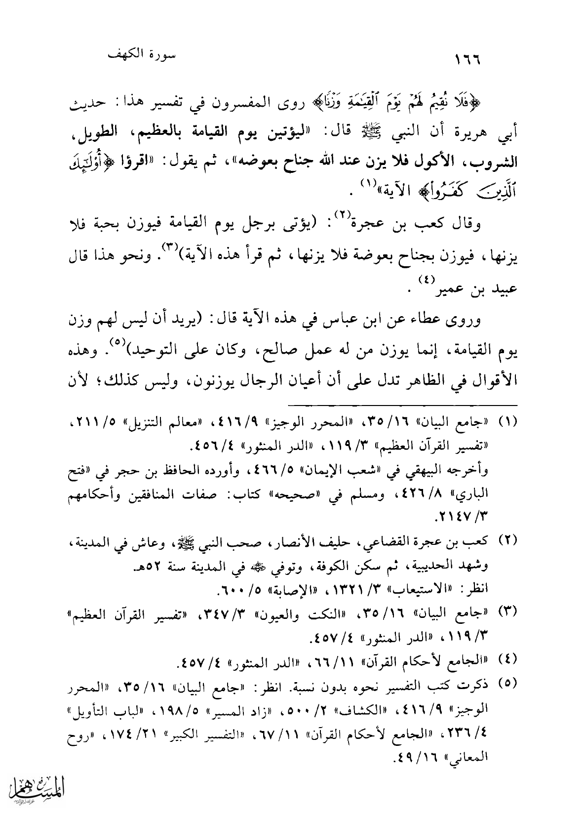 {فَلَا نُقِيمُ لَهُمْ يَوْمَ الْقِيَامَةِ وَزْنًا} روى المفسرون في تفسير هذا: حديث أبي هريرة أن النبي -صلى الله عليه وسلم- قال: "ليؤتين يوم القيامة بالعظيم، الطويل، الشروب، الأكلول فلا يزن عند الله جناح بعوضه"، ثم يقول: "اقرؤا {أُولَئِكَ الَّذِينَ كَفَرُوا} الآية" (¬1).