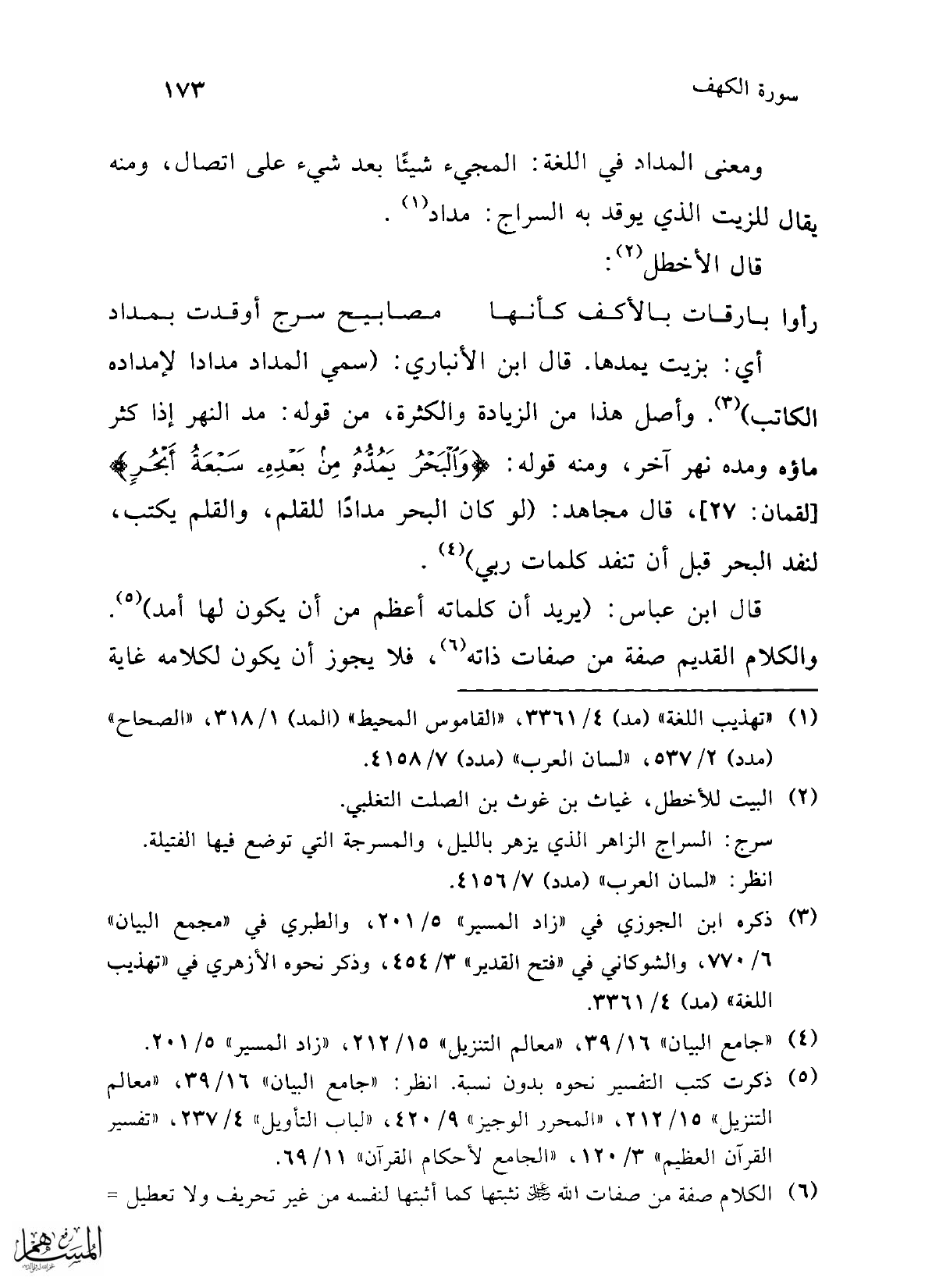 أي: بزيت يمدها. قال ابن الأنباري: (سمي المداد مدادا لإمداده الكاتب) (¬3). وأصل هذا من الزيادة والكثرة، من قوله: مد النهر إذا كثر ماؤه ومده نهر آخر، ومنه قوله: {وَالْبَحْرُ يَمُدُّهُ مِنْ بَعْدِهِ سَبْعَةُ أَبْحُرٍ} [لقمان: 27]، قال مجاهد: (لو كان البحر مدادًا للقلم، والقلم يكتب، لنفد البحر قبل أن تنفد كلمات ربي) (¬4).