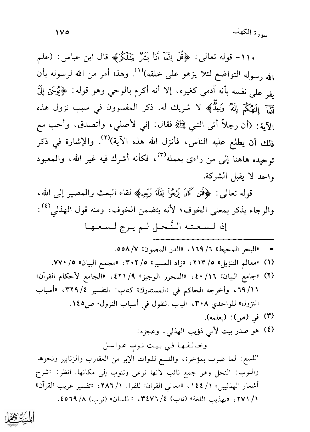 110 - قوله تعالى: {قُلْ إِنَّمَا أَنَا بَشَرٌ مِثْلُكُمْ} قال ابن عباس: (علم الله رسوله التواضع لئلا يزهو على خلقه) (¬1). وهذا أمر من الله لرسوله بأن يقر على نفسه بأنه آدمي كغيره، إلا أنه أكرم بالوحي وهو قوله: {يُوحَى إِلَيَّ أَنَّمَا إِلَهُكُمْ إِلَهٌ وَاحِدٌ} لا شريك له. ذكر المفسرون في سبب نزول هذه الآية: (أن رجلاً أتى النبي -صلى الله عليه وسلم- فقال: إني لأصلي، وأتصدق، وأحب مع ذلك أن يطلع عليه الناس، فأنزل الله هذه الآية) (¬2). والإشارة في ذكر توحيده هاهنا إلى من راءى بعمله (¬3)، فكأنه أشرك فيه غير الله، والمعبود واحد لا يقبل الشركة.