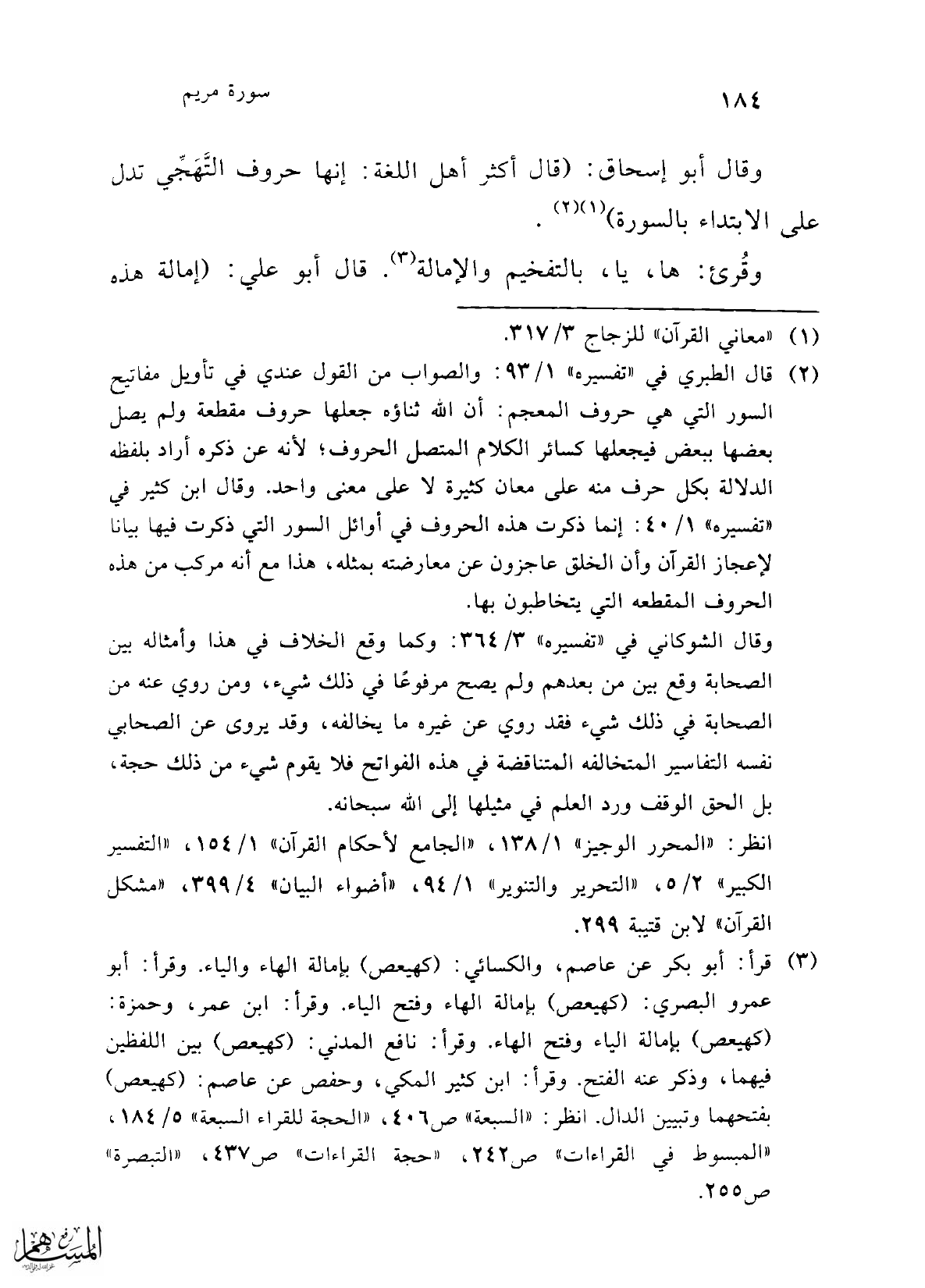 (¬3) قرأ: أبو بكر عن عاصم، والكسائي: (كهيعص) بإمالة الهاء والياء. وقرأ: أبو عمرو البصري: (كهيعص) بإمالة الهاء وفتح الياء. وقرأ: ابن عمر، وحمزة: (كهيعص) بإمالة الياء وفتح الهاء. وقرأ: نافع المدني: (كهيعص) بين اللفظين فيهما، وذكر عنه الفتح. وقرأ: ابن كثير المكي، وحفص عن عاصم: (كهيعص) بفتحهما وتبيين الدال. انظر: "السبعة" ص 406، "الحجة للقراء السبعة" 5/ 184، "المبسوط في القراءات" ص 242، "حجة القراءات" ص 437، "التبصرة" ص 255.