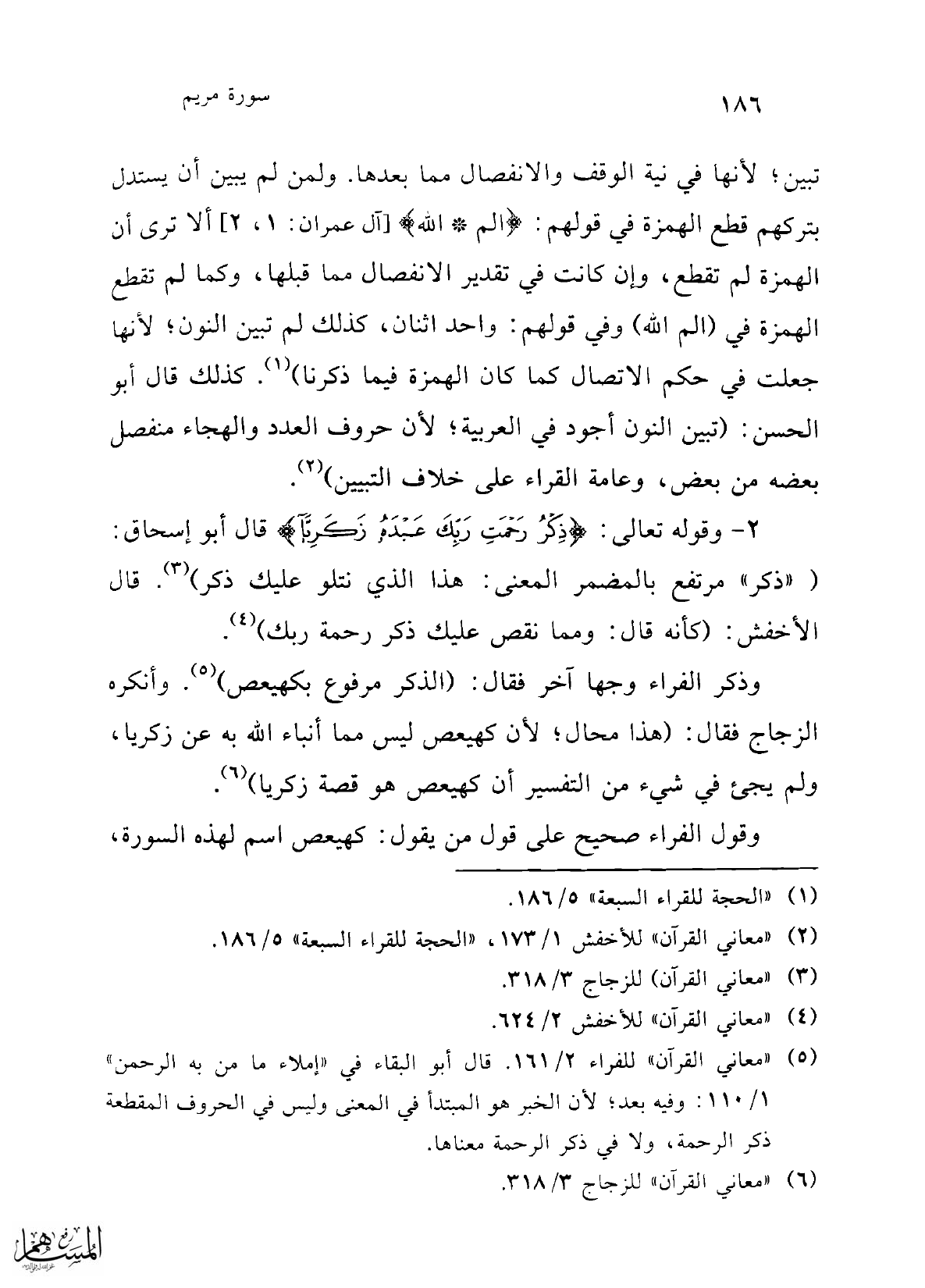 وذكر الفراء وجها آخر فقال: (الذكر مرفوع بكهيعص) (4). وأنكره الزجاج فقال: (هذا محال؛ لأن كهيعص ليس مما أنباء الله به عن زكريا، ولم يجيء في شيء من التفسير أن كهيعص هو قصة زكريا) (6).