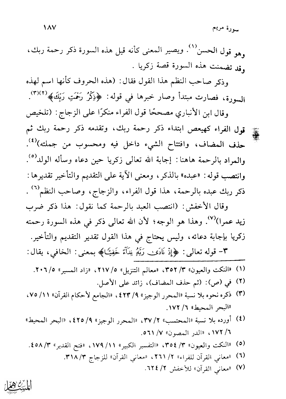 وقال الأخفش: (انتصب العبد بالرحمة كما نقول: هذا ذكر ضرب زيد عمرا) (¬7). وهذا هو الوجه؛ لأن الله تعالى ذكر في هذه السورة رحمته زكريا بإجابة دعائه، وليس يحتاج في هذا القول تقدير التقديم والتأخير.