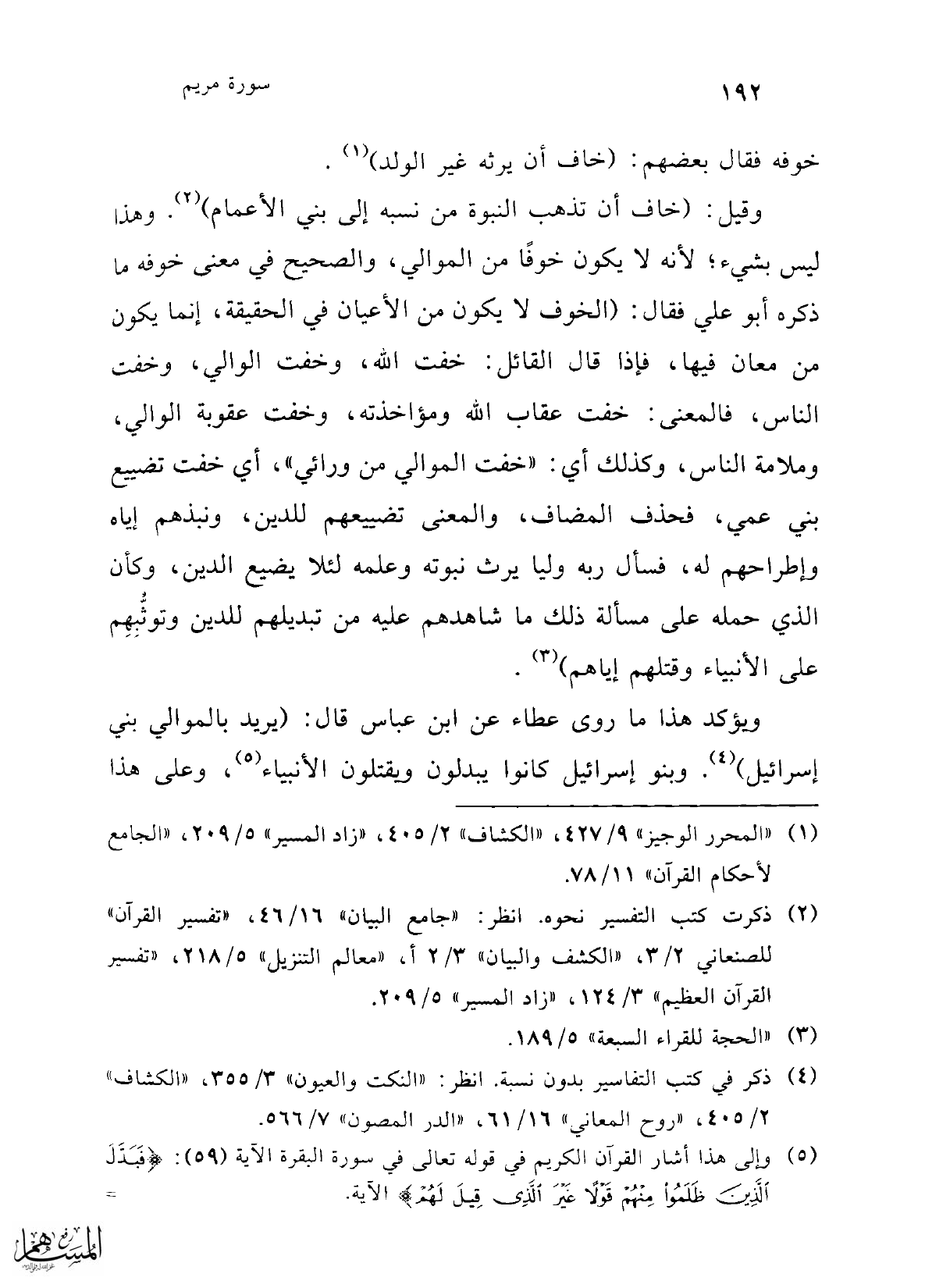 وقيل: (خاف أن تذهب النبوة من نسبه إلى بني الأعمام) (¬2). وهذا ليس بشيء؛ لأنه لا يكون خوفًا من الموالي، والصحيح في معنى خوفه ما ذكره أبو علي فقال: (الخوف لا يكون من الأعيان في الحقيقة، إنما يكون من معان فيها، فإذا قال القائل: خفت الله، وخفت الوالي، وخفت الناس، فالمعنى: خفت عقاب الله ومؤاخذته، وخفت عقوبة الوالي، وملامة الناس، وكذلك أي: "خفت الموالي من ورائي"، أي خفت تضيج بني عمي، فحذف المضاف، والمعنى تضييعهم للدين، ونبذهم إياه وإطراحهم له، فسأل ربه وليا يرث نبوته وعلمه لئلا يضيع الدين، وكأن الذي حمله على مسألة ذلك ما شاهدهم عليه من تبديلهم للدين وتوثُّبِهِم على الأنبياء وقتلهم إياهم) (¬3).