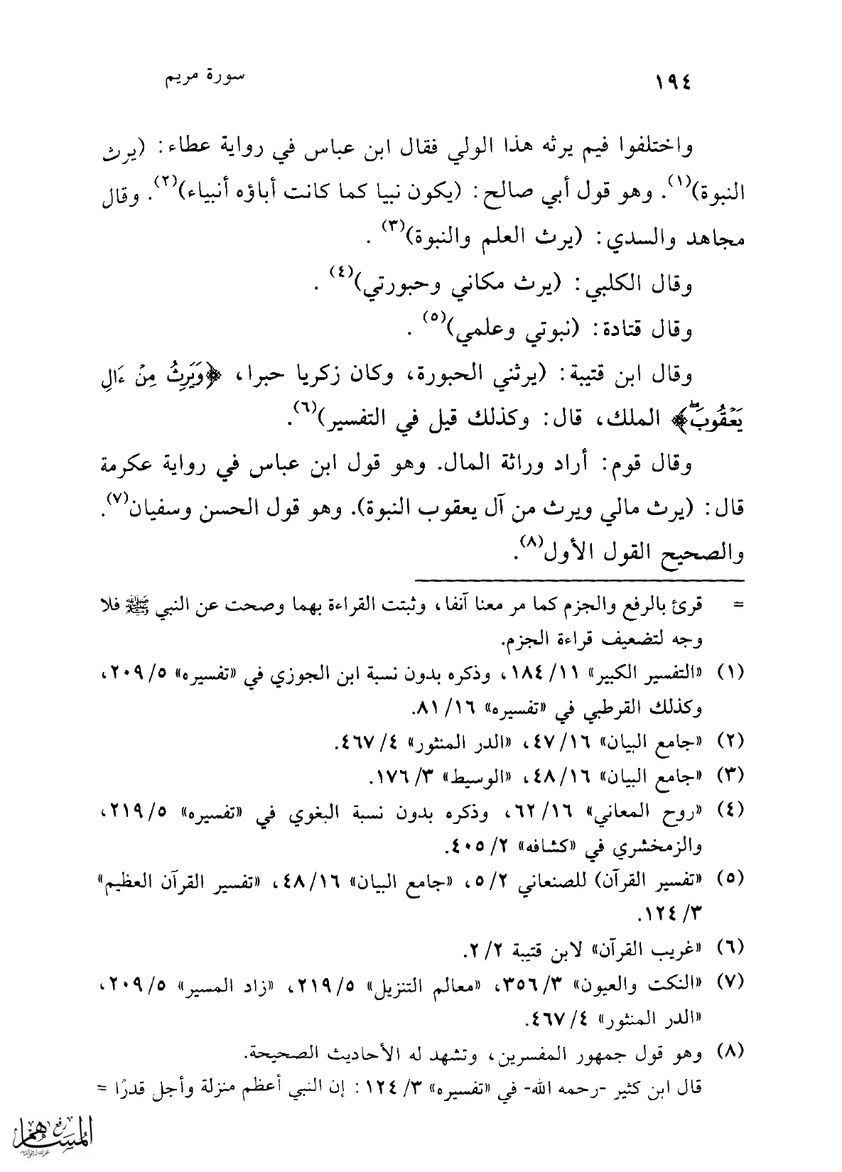 وقال ابن قتيبة: (يرثني الحبورة، وكان زكريا حبرا، {وَيَرِثُ مِنْ آلِ يَعْقُوبَ} الملك، قال: وكذلك قيل في التفسير) (¬6).