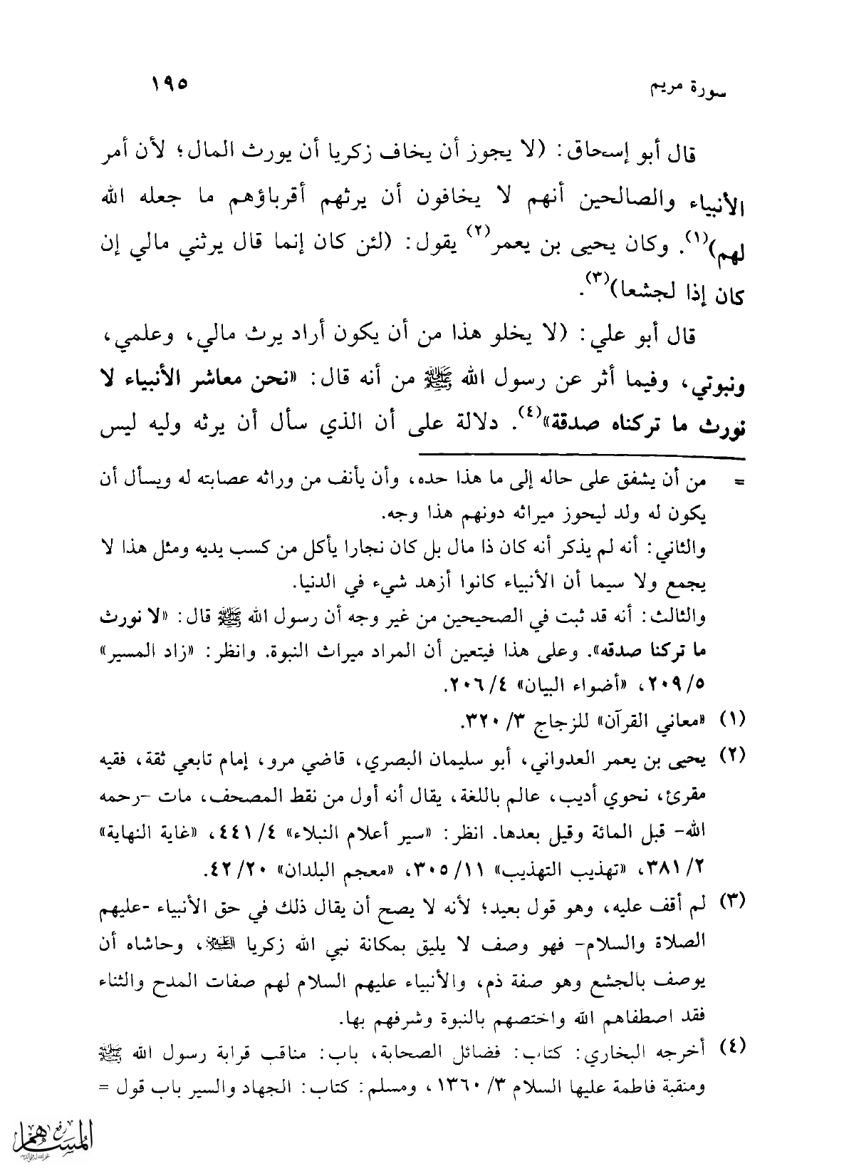 والثالث: أنه قد ثبت في الصحيحين من غير وجه أن رسول الله -صلى الله عليه وسلم- قال: "لا نورث مما تركنا صدقه". وعلى هذا فيتعين أن المراد ميراث النبوة. وانظر: "زاد المسير" 5/ 209، "أضواء البيان" 4/ 206.