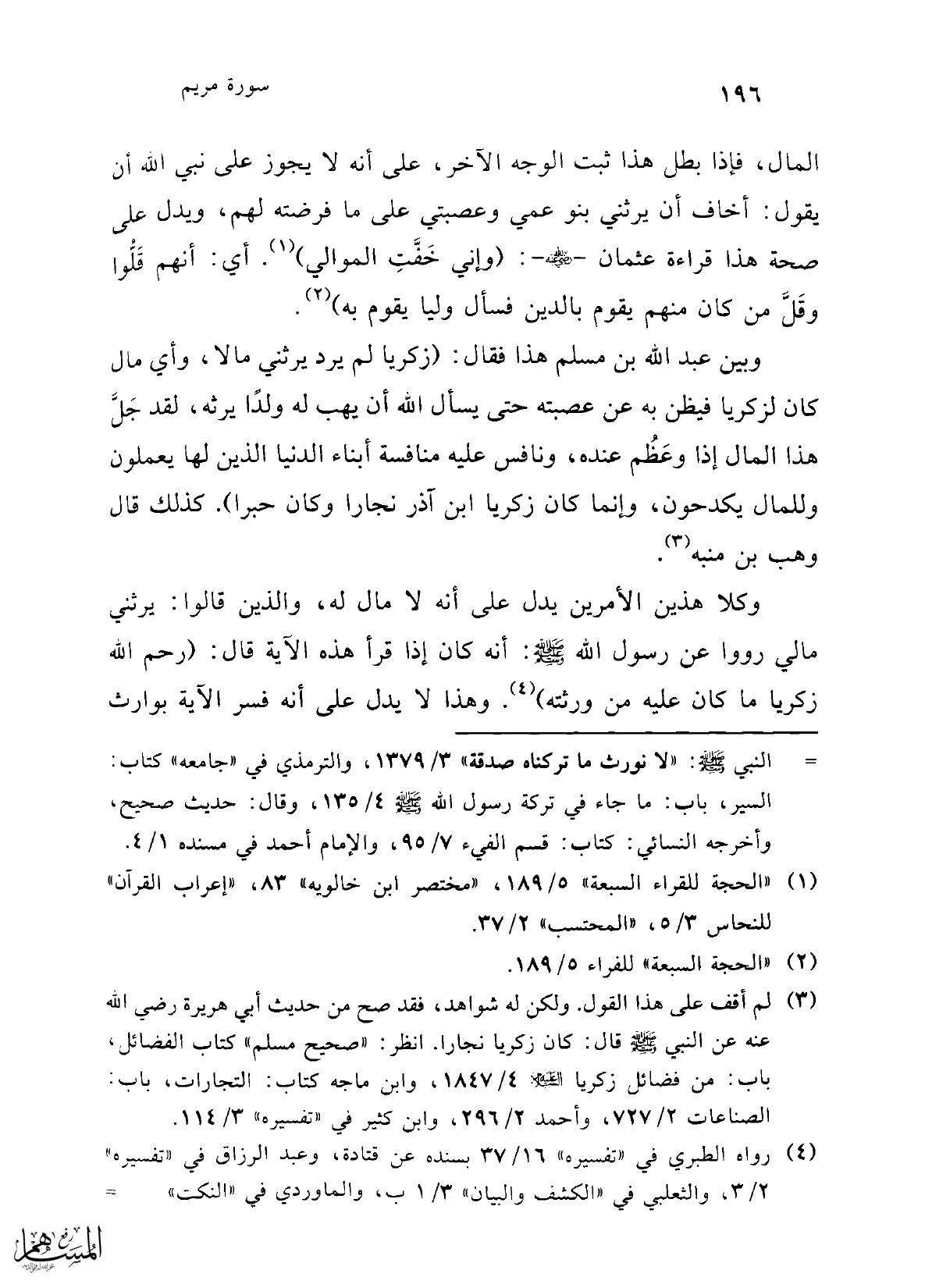 وبين عبد الله بن مسلم هذا فقال: (زكريا لم يرد يرثني مالا، وأي مال كان لزكريا فيظن به عن عصبته حتى يسأل الله أن يهب له ولدًا يرثه، لقد جَلَّ هذا المال إذا وعَظُم عنده، ونافس عليه منافسة أبناء الدنيا الذين لها يعملون وللمال يكدحون، وإنما كان زكريا ابن آذر نجارا وكان حبرا). كذلك قال وهب بن منبه (¬3).