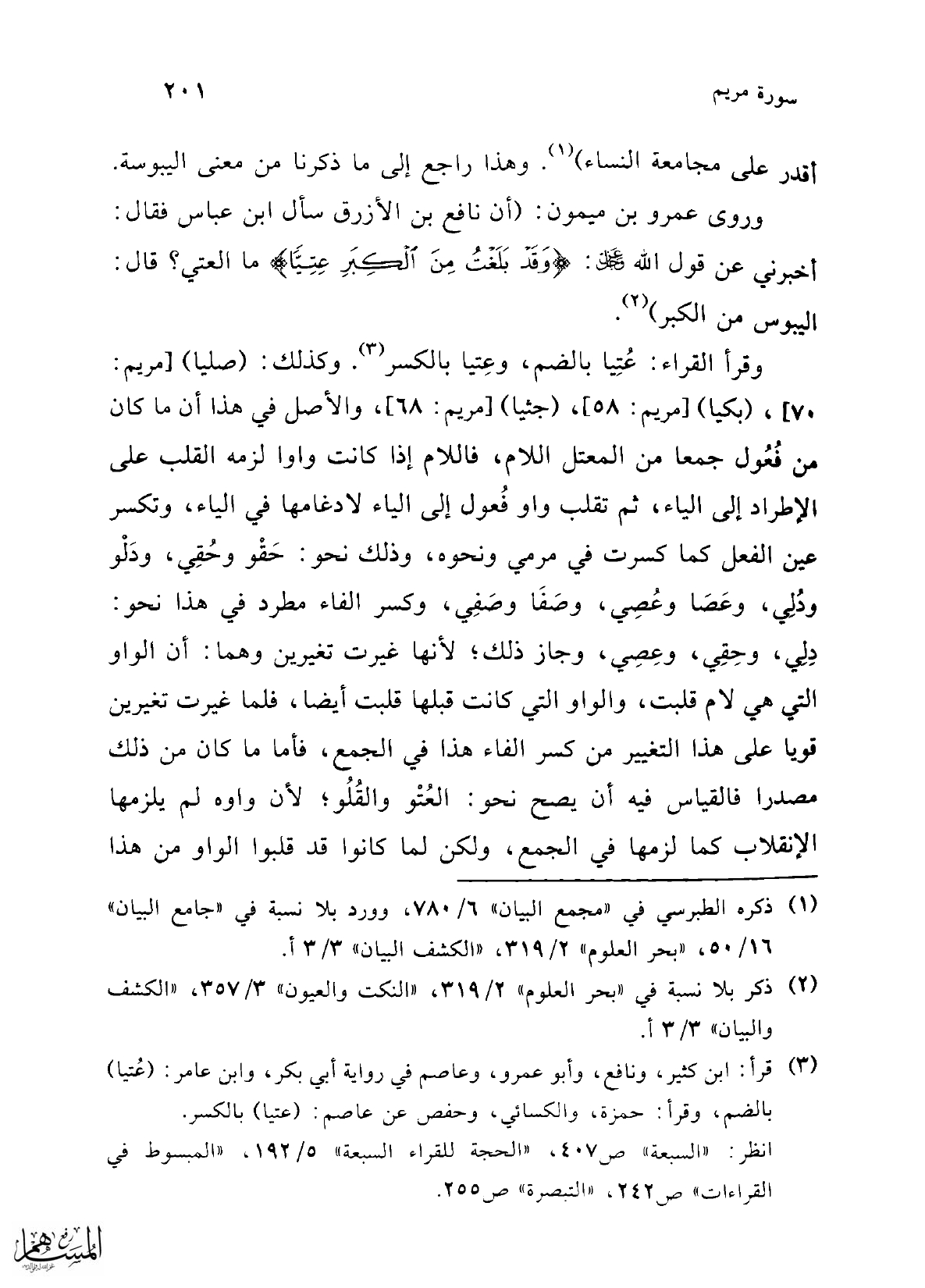 (¬3) قرأ: ابن كثير، ونافع، وأبو عمرو، وعاصم في رواية أبي بكر، وابن عامر: (عُتيا) بالضم، وقرأ: حمزة، والكسائي، وحفصر عن عاصم: (عتيا) بالكسر.