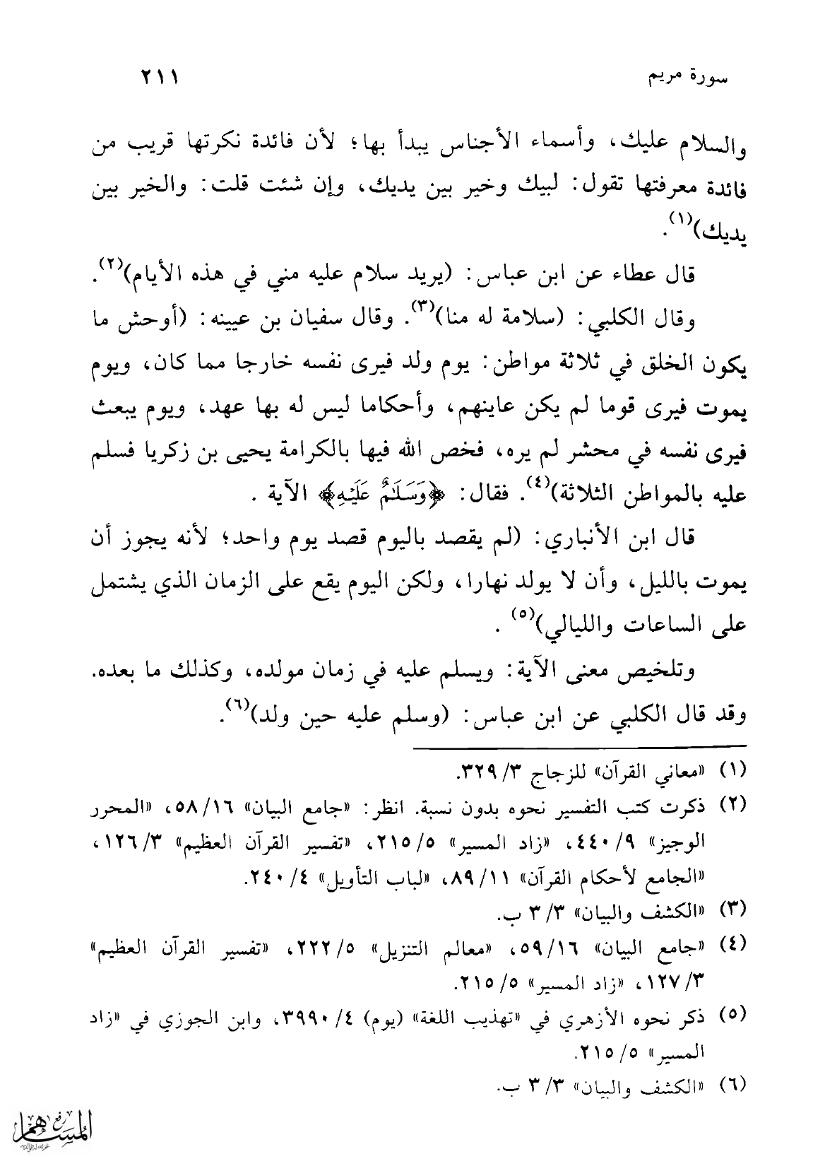 وتلخيص معنى الآية: ويسلم عليه في زمان مولده، وكذلك ما بعده. وقد قال الكلبي عن ابن عباس: (وسلم عليه حين ولد) (¬6).