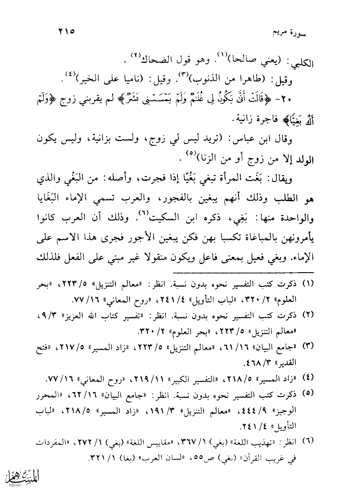 20 - {قَالَتْ أَنَّى يَكُونُ لِي غُلَامٌ وَلَمْ يَمْسَسْنِي بَشَرٌ} لم يقربني زوج {وَلَمْ أَكُ بَغِيًّا} فاجرة زانية.