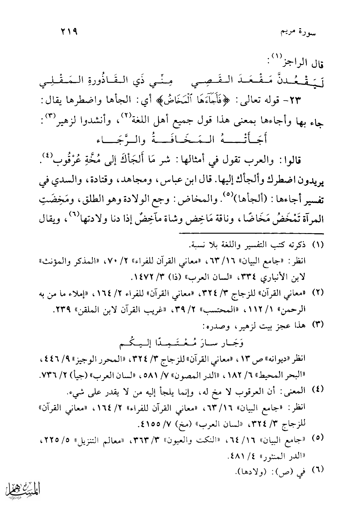 23 - قوله تعالى: {فَأَجَاءَهَا الْمَخَاضُ} أي: الجأها واضطرها يقال: جاء بها وأجاءها بمعنى هذا قول جميع أهل اللغة (¬2)، وأنشدوا لزهير (¬3):