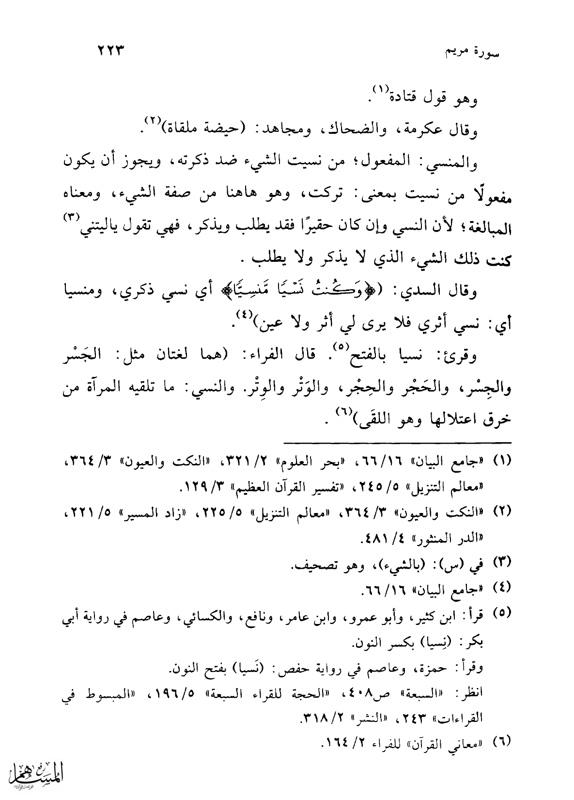 (¬5) قرأ: ابن كثير، وأبو عمرو، وابن عامر، ونافع، والكسائي، وعاصم في رواية أبي بكر: (نِسيا) بكسر النون.