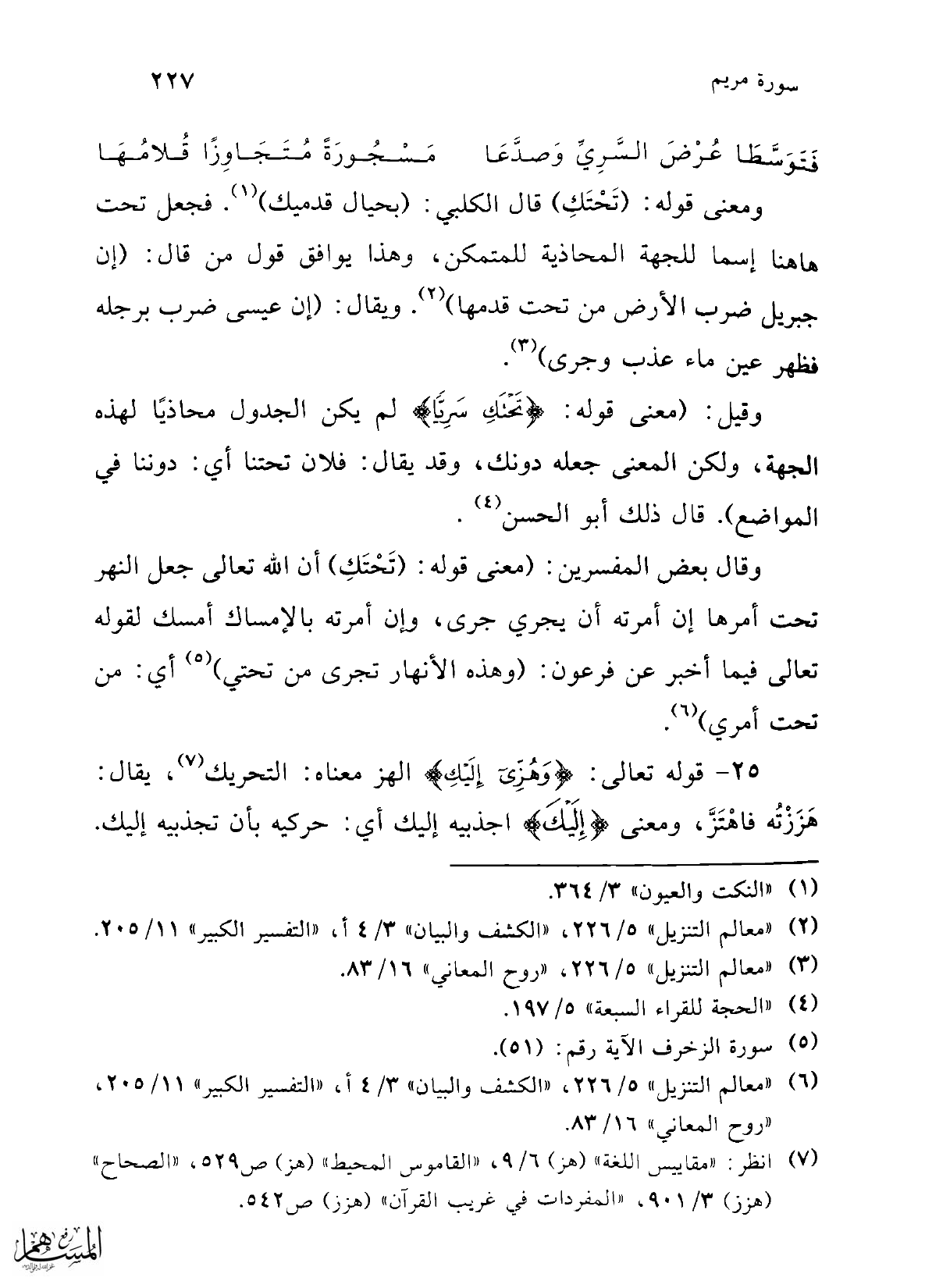 وقال بعض المفسرين: (معنى قوله: (تَحْتَكِ) أن الله تعالى جعل النهر تحت أمرها إن أمرته أن يجري جرى، وإن أمرته بالإمساك أمسك لقوله تعالى فيما أخبر عن فرعون: (وهذه الأنهار تجرى من تحتي) (¬5) أي: من تحت أمري) (¬6).