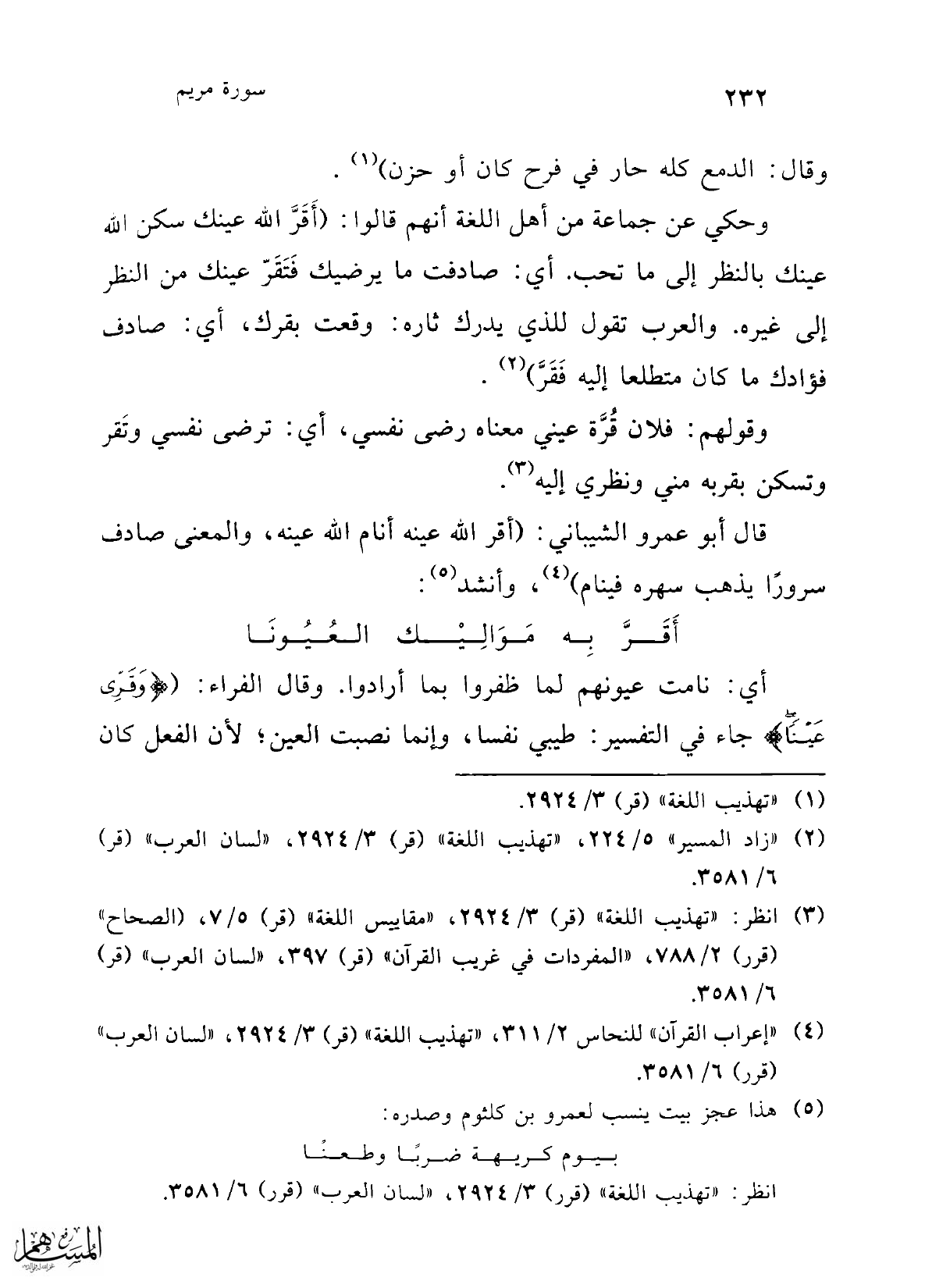 (¬3) انظر: "تهذيب اللغة" (قر) 3/ 2924، "مقاييس اللغة" (قر) 5/ 7، "الصحاح" (قرر) 2/ 788، "المفردات في غريب القرآن" (قر) 397، "لسان العرب" (قر) 6/ 3581.