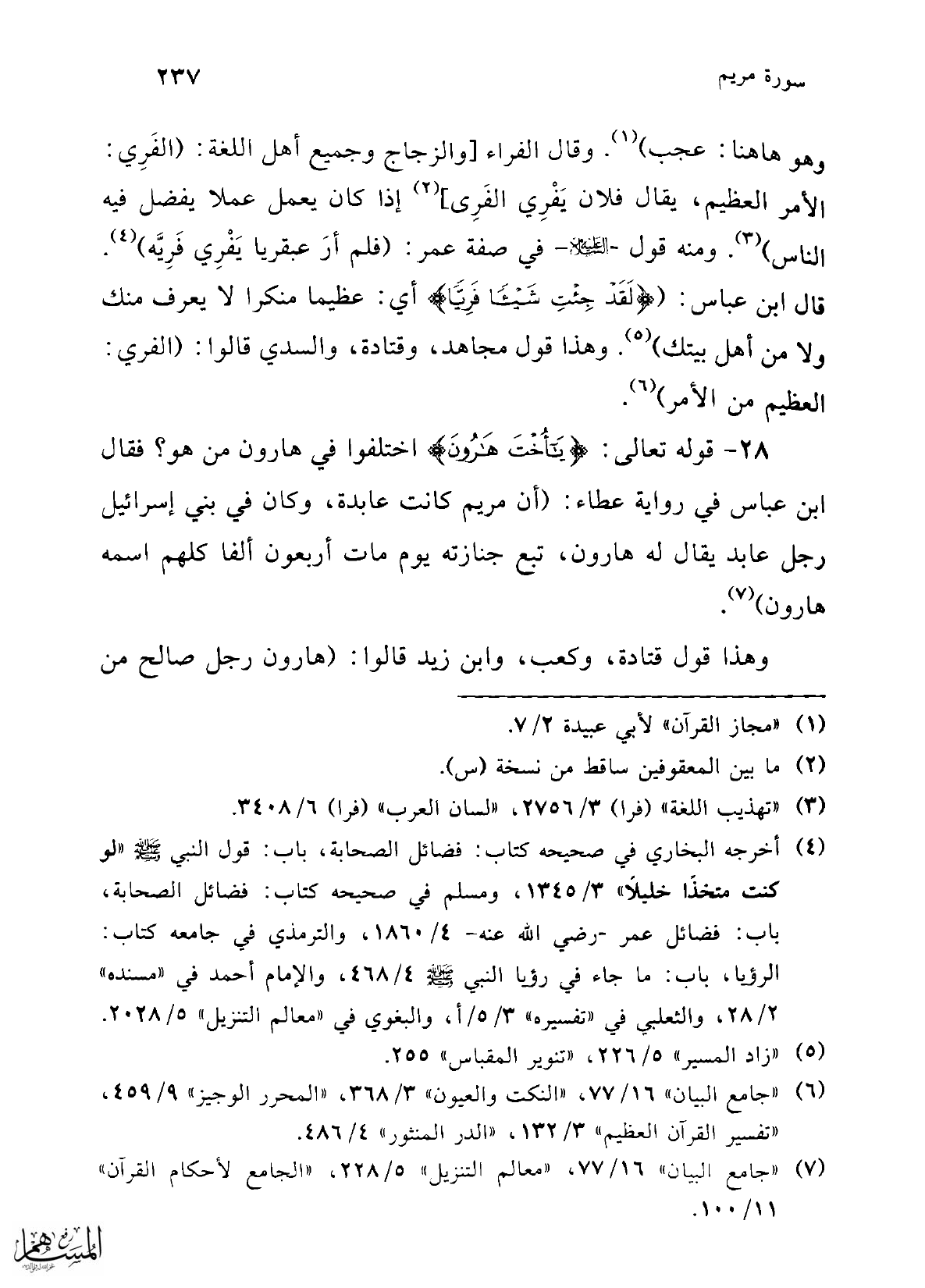 28 - قوله تعالى: {يَا أُخْتَ هَارُونَ} اختلفوا في هارون من هو؟ فقال ابن عباس في رواية عطاء: (أن مريم كانت عابدة، وكان في بني إسرائيل رجل عابد يقال له هارون، تبع جنازته يوم مات أربعون ألفا كلهم اسمه هارون) (¬7).