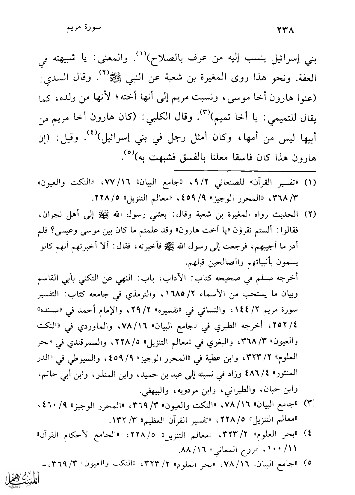 (¬2) الحديث رواه المغيرة بن شعبة وقال: بعثني رسول الله -صلى الله عليه وسلم- إلى أهل نجران، فقالوا: ألستم تقرؤن "يا أخت هارون" وقد علمتم ما كان بين موسى وعيسى؟ فلم أدر ما أجيبهم، فرجعت إلى رسول الله -صلى الله عليه وسلم- فأخبرته، فقال: ألا أخبرتهم أنهم كانوا يسمون بأنبيائهم والصالحين قبلهم.