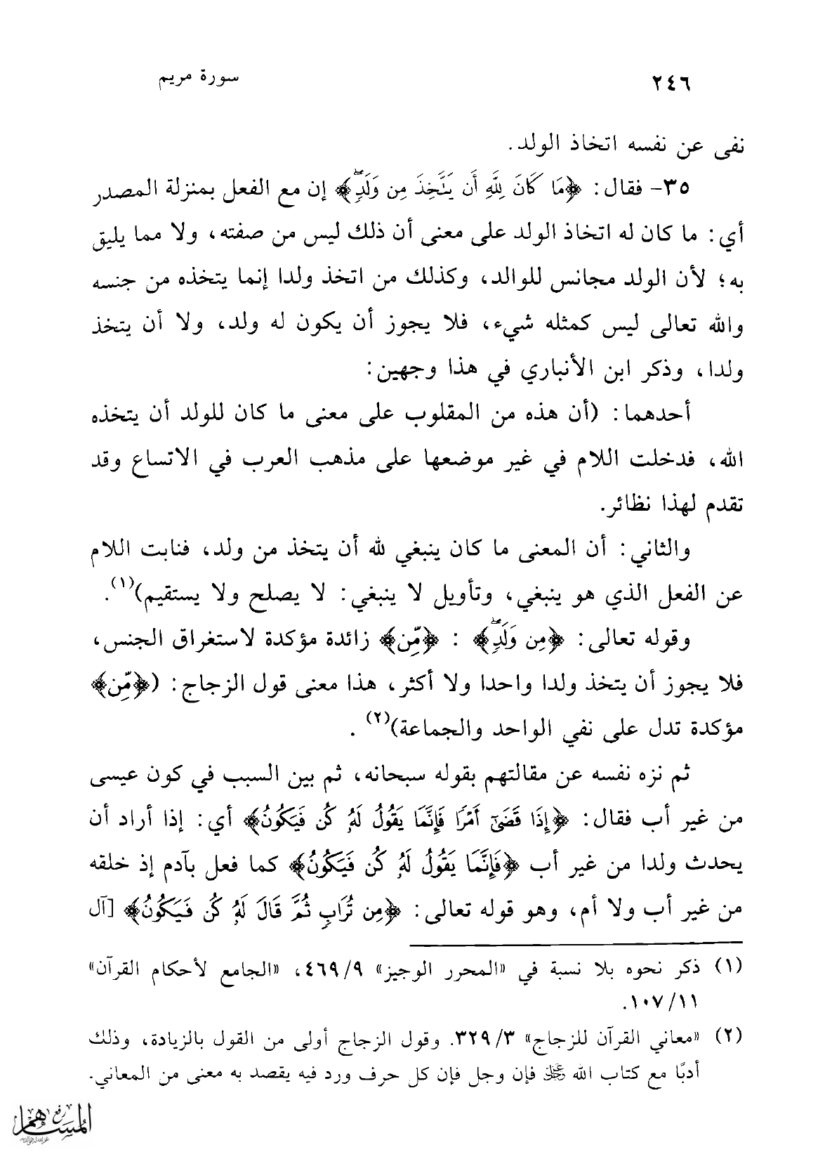 35 - فقال؛ {مَا كَانَ لِلَّهِ أَنْ يَتَّخِذَ مِنْ وَلَدٍ} إن مع الفعل بمنزلة المصدر أي: ما كان له اتخاذ الولد على معنى أن ذلك ليس من صفته، ولا مما يليق به؛ لأن الولد مجانس للوالد، وكذلك من اتخذ ولدا إنما يتخذه من جنسه والله تعالى ليس كمثله شيء، فلا يجوز أن يكون له ولد، ولا أن يتخذ ولدا، وذكر ابن الأنباري في هذا وجهين: