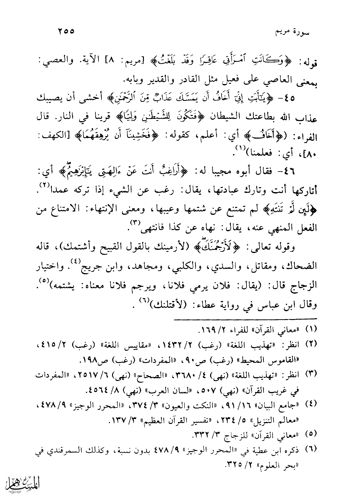 46 - فقال أبوه مجيبا له: {أَرَاغِبٌ أَنْتَ عَنْ آلِهَتِي يَا إِبْرَاهِيمُ} أي: أتاركها أنت وتارك عبادتها، يقال: رغب عن الشيء إذا تركه عمدا (¬2). {لَئِنْ لَمْ تَنْتَهِ} لم تمتنع عن شتمها وعيبها، ومعنى الإنتهاء: الامتناع من الفعل المنهي عنه، يقال: نهاه عن كذا فانتهى (¬3).